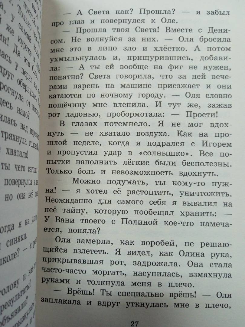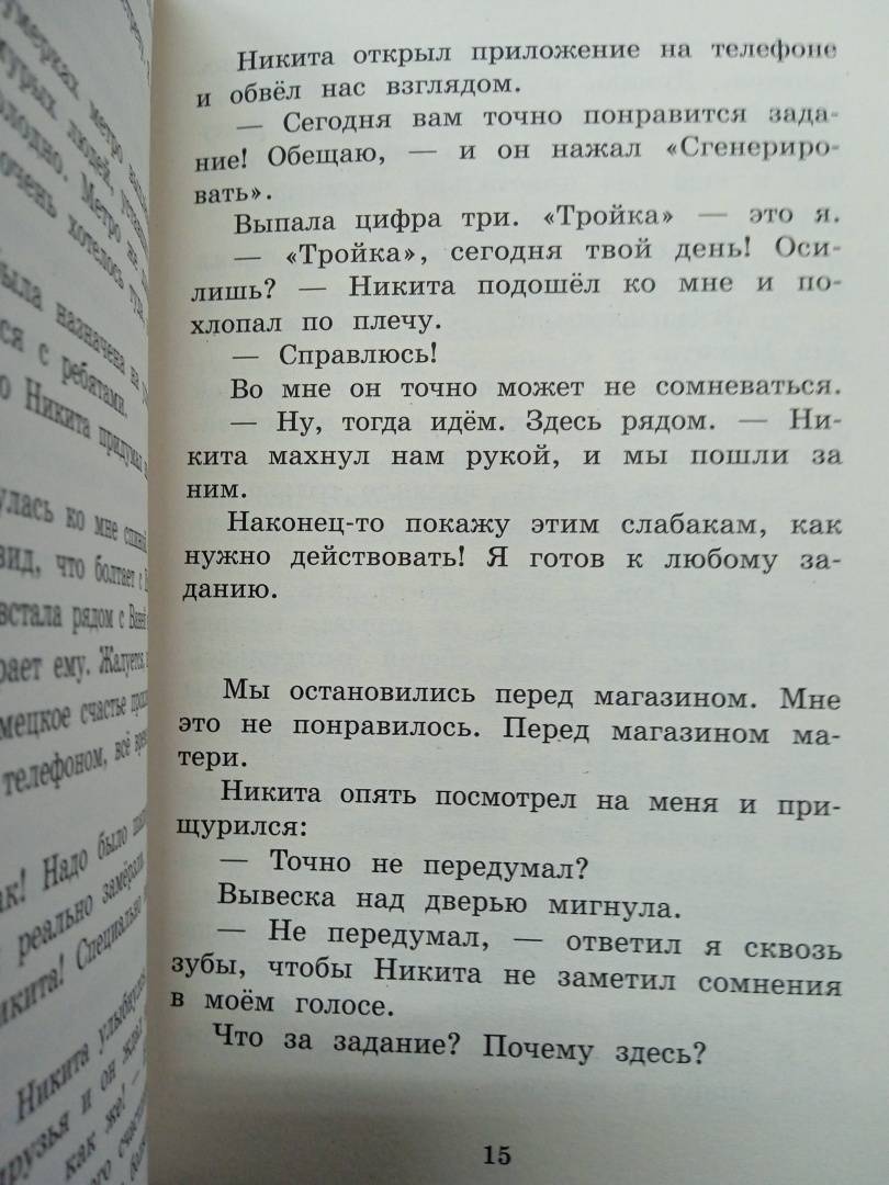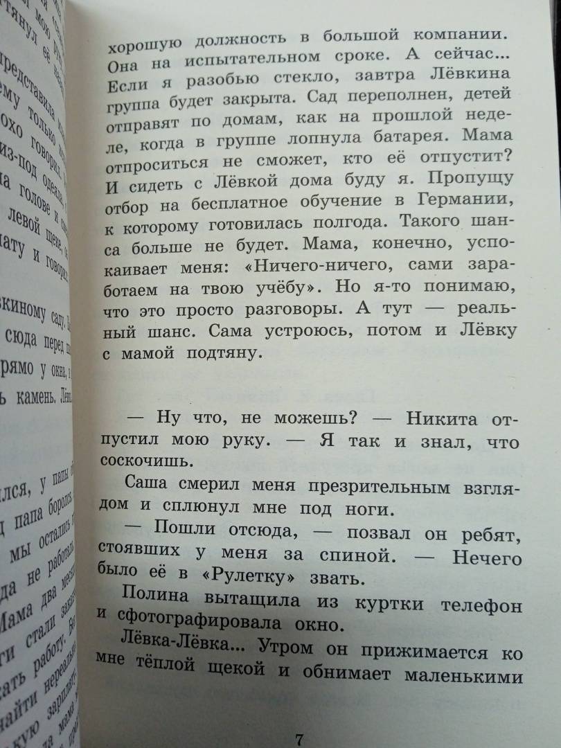 Описание"Рулетка" - это новая игра в реальности для старшеклассников. Попасть в неё - значит стать избранным. Ведь создатель игры, Никита, набирает всего семь игроков. Правило только одно: выполняешь задание или выбываешь.Каждое задание попадает в самую болевую точку игрока. Оле приходится разбить стекло в детском саду, куда ходит её младший брат. Саше - совершить кражу в магазине, где работает мама. Денису - испортить конкурсную работу подруги. Задания становятся всё сложнее, и вот уже ребята готовы разбить не только стекло, но и жизнь. Свою и своих близких. Последствия необратимы. Одна из участниц игры - в больнице, другой - жестоко избит в драке. А сам Никита вот-вот потеряет то, ради чего это всё затеял.Это книга о выборе. Только ты решаешь, идти на этот шаг или нет."Рулетка" - это новая игра в реальности для старшеклассников. Попасть в неё - значит стать избранным. Ведь создатель игры, Никита, набирает всего семь игроков. Правило только одно: выполняешь задание или выбываешь.Каждое задание попадает в самую болевую точку игрока. Оле приходится разбить стекло в детском саду, куда ходит её младший брат. Саше - совершить кражу в магазине, где работает мама. Денису - испортить конкурсную работу подруги. Задания становятся всё сложнее, и вот уже ребята готовы разбить не только стекло, но и жизнь. Свою и своих близких. Последствия необратимы. Одна из участниц игры - в больнице, другой - жестоко избит в драке. А сам Никита вот-вот потеряет то, ради чего это всё затеял.Это книга о выборе. Только ты решаешь, идти на этот шаг или нет.
