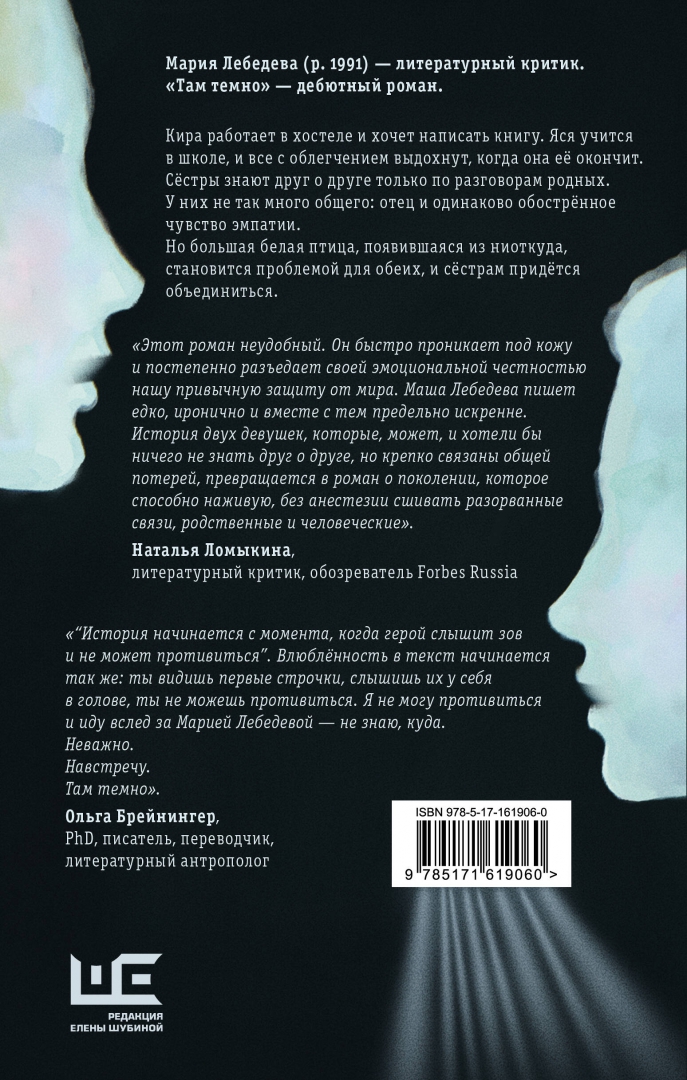 ОписаниеМария Лебедева (р. 1991) - литературный критик. "Там темно" - дебютный роман. Кира работает в хостеле и хочет написать книгу. Яся учится в школе, и все с облегчением выдохнут, когда она её окончит. Сёстры знают друг о друге только по разговорам родных. У них не так много общего: отец и одинаково обострённое чувство эмпатии.Но большая белая птица, появившаяся из ниоткуда, становится проблемой для обеих, и сёстрам придётся объединиться."Этот роман неудобный. Он быстро проникает под кожу и постепенно разъедает своей эмоциональной честностью нашу привычную защиту от мира. Маша Лебедева пишет едко, иронично и вместе с тем предельно искренне. История двух девушек, которые, может, и хотели бы ничего не знать друг о друге, но крепко связаны общей потерей, превращается в роман о поколении, которое способно наживую, без анестезии сшивать разорванные связи, родственные и человеческие".Наталья Ломыкина, литературный критик, обозреватель Forbes Russia""История начинается с момента, когда герой слышит зов и не может противиться". Влюблённость в текст начинается так же: ты видишь первые строчки, слышишь их у себя в голове, ты не можешь противиться. Я не могу противиться и иду вслед за Марией Лебедевой - не знаю, куда.Неважно.Навстречу.Там темно".Ольга Брейнингер, PhD, писатель, переводчик, литературный антропологСвернутьМария Лебедева (р. 1991) - литературный критик. "Там темно" - дебютный роман. Кира работает в хостеле и хочет написать книгу. Яся учится в школе, и все с облегчением выдохнут, когда она её окончит. Сёстры знают друг о друге только по разговорам родных. У них не так много общего: отец и одинаково обострённое чувство эмпатии.Но большая белая птица, появившаяся из ниоткуда, становится проблемой для обеих, и сёстрам придётся объединиться."Этот роман неудобный. Он быстро проникает под кожу и постепенно разъедает своей эмоциональной честностью нашу привычную защиту от мира. Маша Лебедева пишет едко, иронично и вместе с тем предельно искренне. История двух девушек, которые, может, и хотели бы ничего не знать друг о друге, но крепко связаны общей потерей, превращается в роман о поколении, которое способно наживую, без анестезии сшивать разорванные связи, родственные и человеческие".Наталья Ломыкина, литературный критик, обозреватель Forbes Russia""История начинается с момента, когда герой слышит зов и не может противиться". Влюблённость в текст начинается так же: ты видишь первые строчки, слышишь их у себя в голове, ты не можешь противиться. Я не могу противиться и иду вслед за Марией Лебедевой - не знаю, куда.Неважно.Навстречу.Там темно".Ольга Брейнингер, PhD, писатель, переводчик, литературный антропологСвернутьСвернуть