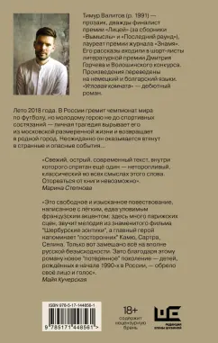 ОписаниеТимур Валитов (р. 1991) - прозаик, дважды финалист премии "Лицей" (за сборники "Вымыслы" и "Последний раунд"), лауреат премии журнала "Знамя". Его рассказы входили в шорт-листы литературной премии Дмитрия Горчева и Волошинского конкурса. Произведения переведены на немецкий и болгарский языки."Угловая комната" - дебютный роман.Лето 2018 года. В России гремит чемпионат мира по футболу, но молодому герою не до спортивных состязаний - личная трагедия вырывает его из московской размеренной жизни и возвращает в родной город. Неожиданно он оказывается втянут в странные и опасные события..."Свежий, острый, современный текст, внутри которого спрятан ещё один - неторопливый, классический во всех смыслах этого слова. Оторваться от книги невозможно".Марина Степнова"Это свободное и изысканное повествование, написанное с лёгким, едва уловимым французским акцентом: здесь много парижских сцен, звучит мелодия из знаменитого фильма "Шербурские зонтики", а главный герой напоминает "посторонних" Камю, Сартра, Селина. Только вот замешано всё на вполне русской безысходности. Зато благодаря этому роману новое "потерянное" поколение - детей, рожденных в начале 1990-х в России, - обрело своё лицо и голос".Майя КучерскаяСвернутьТимур Валитов (р. 1991) - прозаик, дважды финалист премии "Лицей" (за сборники "Вымыслы" и "Последний раунд"), лауреат премии журнала "Знамя". Его рассказы входили в шорт-листы литературной премии Дмитрия Горчева и Волошинского конкурса. Произведения переведены на немецкий и болгарский языки."Угловая комната" - дебютный роман.Лето 2018 года. В России гремит чемпионат мира по футболу, но молодому герою не до спортивных состязаний - личная трагедия вырывает его из московской размеренной жизни и возвращает в родной город. Неожиданно он оказывается втянут в странные и опасные события..."Свежий, острый, современный текст, внутри которого спрятан ещё один - неторопливый, классический во всех смыслах этого слова. Оторваться от книги невозможно".Марина Степнова"Это свободное и изысканное повествование, написанное с лёгким, едва уловимым французским акцентом: здесь много парижских сцен, звучит мелодия из знаменитого фильма "Шербурские зонтики", а главный герой напоминает "посторонних" Камю, Сартра, Селина. Только вот замешано всё на вполне русской безысходности. Зато благодаря этому роману новое "потерянное" поколение - детей, рожденных в начале 1990-х в России, - обрело своё лицо и голос".Майя КучерскаяСвернутьСвернуть