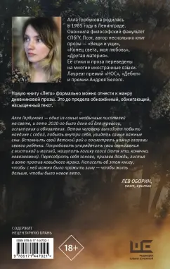 ОписаниеАлла Горбунова родилась в 1985 году в Ленинграде. Окончила философский факультет СПбГУ. Поэт, автор нескольких книг прозы — "Вещи и ущи", "Конец света, моя любовь", "Другая материя". Её стихи и проза переведены на многие иностранные языки. Лауреат премий "НОС", "Дебют" и премии Андрея Белого.Новую книгу Горбуновой формально можно отнести к жанру дневниковой прозы. "Лето" соткано из философских размышлений и мистических озарений, тончайших описаний природы и быта и полных глубокой нежности наблюдений за взрослением ребёнка. Это до предела обнажённый, обжигающий, насыщенный текст.Алла Горбунова — одна из самых необычных писателей на свете, и лето 2020-го было дано ей для тревоги, испытания и обновления. Летом человеку выпадает побыть наедине с собой, побыть внутри себя, увидеть самые важные сны. Вспомнить свой детский рай и посмотреть на мир глазами своего ребёнка. Попробовать упорядочить свои отношения с мистикой и магией, нащупать логику хаоса (хотя это, конечно, невозможно). Пересобрать себя заново, призвав дождь, листья и волю против ковидного мрака. Написать об этом книгу, чтобы с ней можно было прожить зиму — чтобы жить дальше, чтобы было новое лето (ЛЕВ ОБОРИН, поэт, критик).СвернутьАлла Горбунова родилась в 1985 году в Ленинграде. Окончила философский факультет СПбГУ. Поэт, автор нескольких книг прозы — "Вещи и ущи", "Конец света, моя любовь", "Другая материя". Её стихи и проза переведены на многие иностранные языки. Лауреат премий "НОС", "Дебют" и премии Андрея Белого.Новую книгу Горбуновой формально можно отнести к жанру дневниковой прозы. "Лето" соткано из философских размышлений и мистических озарений, тончайших описаний природы и быта и полных глубокой нежности наблюдений за взрослением ребёнка. Это до предела обнажённый, обжигающий, насыщенный текст.Алла Горбунова — одна из самых необычных писателей на свете, и лето 2020-го было дано ей для тревоги, испытания и обновления. Летом человеку выпадает побыть наедине с собой, побыть внутри себя, увидеть самые важные сны. Вспомнить свой детский рай и посмотреть на мир глазами своего ребёнка. Попробовать упорядочить свои отношения с мистикой и магией, нащупать логику хаоса (хотя это, конечно, невозможно). Пересобрать себя заново, призвав дождь, листья и волю против ковидного мрака. Написать об этом книгу, чтобы с ней можно было прожить зиму — чтобы жить дальше, чтобы было новое лето (ЛЕВ ОБОРИН, поэт, критик).СвернутьСвернуть