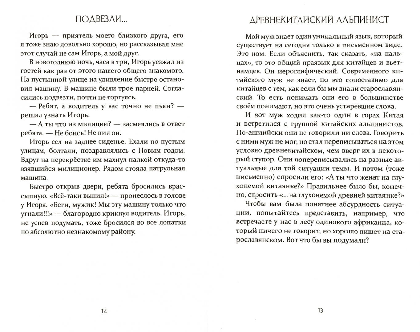 Описание"...а ещё эта коробка получается немного волшебной. В ней никогда не кончаются конфеты. Очень, кстати, удобно. Так и истории в этой книжке. Разные по форме и по содержанию, весёлые и не очень, странные и неожиданные. Истории можно перебирать, читать в каком угодно порядке. И за мою уже не очень короткую жизнь таких историй, а может, и просто случаев, которые достойны того, чтобы быть хоть однажды рассказанными, наслучалось изрядно. Но всё же я решила немного позаимствовать и чужие истории, произошедшие с моими близкими, друзьями и хорошими знакомыми. Они мне их милостиво "подарили". Вас, кстати, тоже приглашаю в соавторы, если книжка понравится, на что, конечно, очень надеюсь.""...а ещё эта коробка получается немного волшебной. В ней никогда не кончаются конфеты. Очень, кстати, удобно. Так и истории в этой книжке. Разные по форме и по содержанию, весёлые и не очень, странные и неожиданные. Истории можно перебирать, читать в каком угодно порядке. И за мою уже не очень короткую жизнь таких историй, а может, и просто случаев, которые достойны того, чтобы быть хоть однажды рассказанными, наслучалось изрядно. Но всё же я решила немного позаимствовать и чужие истории, произошедшие с моими близкими, друзьями и хорошими знакомыми. Они мне их милостиво "подарили". Вас, кстати, тоже приглашаю в соавторы, если книжка понравится, на что, конечно, очень надеюсь."