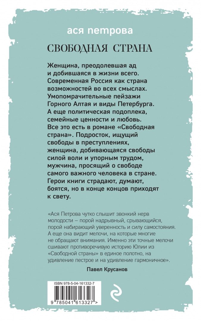 ОписаниеЖенщина, преодолевшая ад и добившаяся в жизни всего. Современная Россия как страна возможностей во всех смыслах. Умопомрачительные пейзажи Горного Алтая и виды Петербурга. А еще политическая подоплека, семейные ценности и любовь. Все это есть в романе "Свободная страна". Подросток, ищущий свободы в преступлениях, женщина, добивающаяся свободы силой воли и упорным трудом, мужчина, просящий о свободе самого важного человека в стране. Герои книги страдают, думают, боятся, но в конце концов приходят к свету. "Ася Петрова чутко слышит звонкий нерв молодости - порой надрывный, срывающийся, порой набирающий уверенность и силу самостояния. А еще она видит мелочи, на которые многие не обращают внимания. Именно эти точные мелочи сшивают противоречивую историю Юлии из "Свободной страны" в единое полотно, на удивление пестрое и на удивление гармоничное". - Павел Крусанов, писатель "Ася Петрова написала роман о страсти, страдании и счастье. И свободе. Просто, увлекательно, достоверно. Женская судьба, которая на глазах срастается с пространствами страны". - Сергей Шаргунов, писатель, политикСвернутьЖенщина, преодолевшая ад и добившаяся в жизни всего. Современная Россия как страна возможностей во всех смыслах. Умопомрачительные пейзажи Горного Алтая и виды Петербурга. А еще политическая подоплека, семейные ценности и любовь. Все это есть в романе "Свободная страна". Подросток, ищущий свободы в преступлениях, женщина, добивающаяся свободы силой воли и упорным трудом, мужчина, просящий о свободе самого важного человека в стране. Герои книги страдают, думают, боятся, но в конце концов приходят к свету. "Ася Петрова чутко слышит звонкий нерв молодости - порой надрывный, срывающийся, порой набирающий уверенность и силу самостояния. А еще она видит мелочи, на которые многие не обращают внимания. Именно эти точные мелочи сшивают противоречивую историю Юлии из "Свободной страны" в единое полотно, на удивление пестрое и на удивление гармоничное". - Павел Крусанов, писатель "Ася Петрова написала роман о страсти, страдании и счастье. И свободе. Просто, увлекательно, достоверно. Женская судьба, которая на глазах срастается с пространствами страны". - Сергей Шаргунов, писатель, политикСвернутьСвернуть