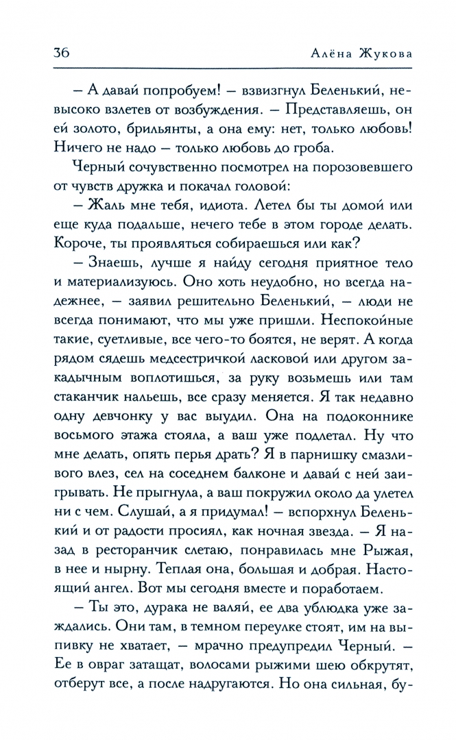 ОписаниеВ книге Алёны Жуковой соединяются восторг и ужас, нежность и жестокость, чудесное и обыденное, миф и документ. Потому что пишет она сказки. Для взрослых. Точнее – для внутреннего ребенка, который есть в любом из нас. Каждая сказка – роман в миниатюре, короткометражный фильм. "Они спустились к Рождеству" – о том, как два ангела, черный и белый, состязаются в борьбе за жизнь рыженькой официантки. "Два кольца, два конца" – о ржавых ножницах, изменивших жизнь одинокой женщины, от которой один за другим ушли муж, дочь и кошка. "Диван" – о судьбоносной подсказке советского дивана оператору Алешке Маркину, переехавшему в Канаду. Все истории Алёны Жуковой держатся на образе, потому что внутри него как раз и сконцентрирована та поэзия, без которой настоящая проза немыслима.В книге Алёны Жуковой соединяются восторг и ужас, нежность и жестокость, чудесное и обыденное, миф и документ. Потому что пишет она сказки. Для взрослых. Точнее – для внутреннего ребенка, который есть в любом из нас. Каждая сказка – роман в миниатюре, короткометражный фильм. "Они спустились к Рождеству" – о том, как два ангела, черный и белый, состязаются в борьбе за жизнь рыженькой официантки. "Два кольца, два конца" – о ржавых ножницах, изменивших жизнь одинокой женщины, от которой один за другим ушли муж, дочь и кошка. "Диван" – о судьбоносной подсказке советского дивана оператору Алешке Маркину, переехавшему в Канаду. Все истории Алёны Жуковой держатся на образе, потому что внутри него как раз и сконцентрирована та поэзия, без которой настоящая проза немыслима.