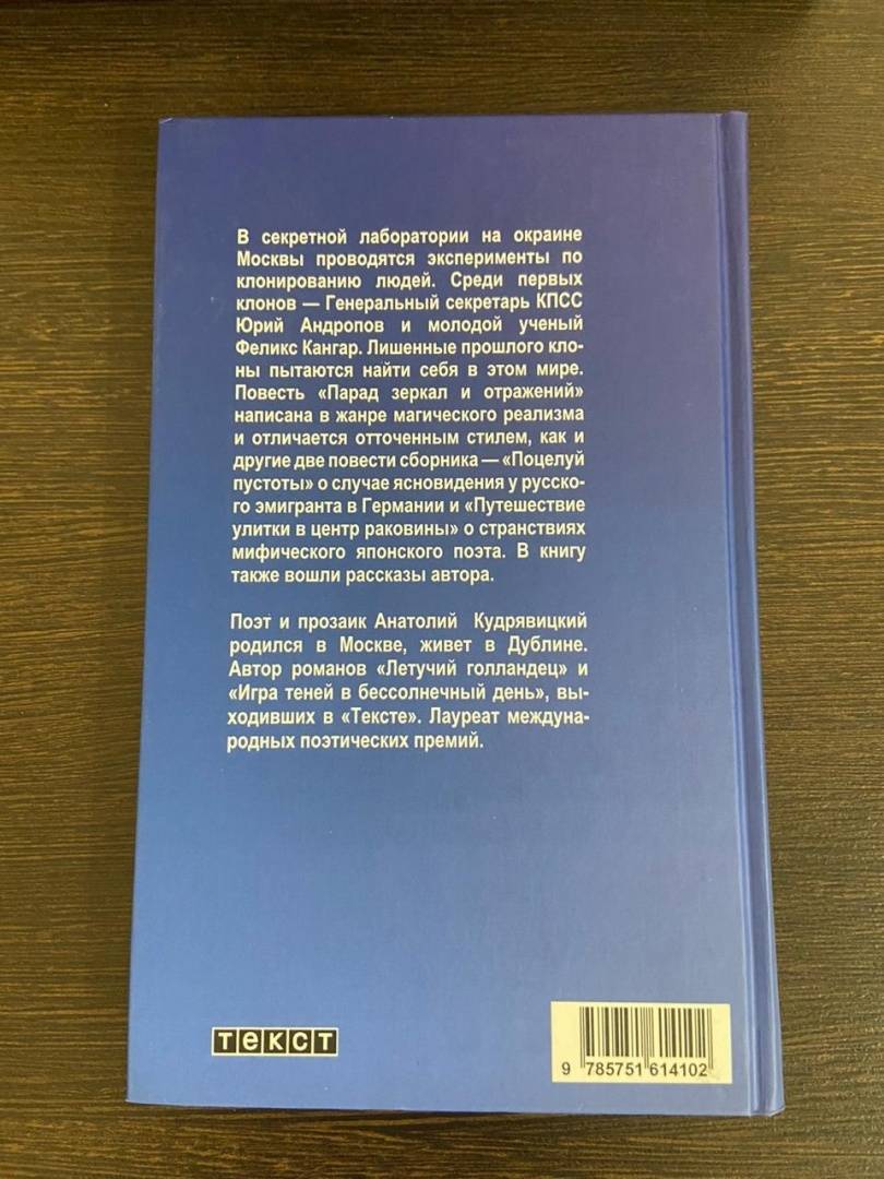 ОписаниеВ подземной лаборатории на окраине Москвы проводятся секретные эксперименты по клонированию людей. Первыми подверглись клонированию Генеральный секретарь КПСС Юрий Андропов и молодой ученый Феликс Кангар. Повесть "Парад зеркал и отражений" написана в жанре магического реализма и отличается отточенным стилем и увлекательным сюжетом, как и другие две повести автора, включенные в этот сборник: "Поцелуй пустоты" о случае ясновидения у русского эмигранта в Германии и "Путешествие улитки в центр раковины" - проникнутая духом дзен притча о странствиях мифического японского поэта конца XIX века. В книгу также вошли лучшие рассказы автора. Поэт и прозаик Анатолий Кудрявицкий родился в Москве, живет в Дублине (Ирландия). Работал редактором в журналах "Огонек" и "Иностранная литература". Автор романов "Летучий голландец" и "Игра теней в бессолнечный день", вышедших в "Тексте" в 2013 и 2014 годах, а также нескольких сборников стихов. Лауреат международных поэтических премий.В подземной лаборатории на окраине Москвы проводятся секретные эксперименты по клонированию людей. Первыми подверглись клонированию Генеральный секретарь КПСС Юрий Андропов и молодой ученый Феликс Кангар. Повесть "Парад зеркал и отражений" написана в жанре магического реализма и отличается отточенным стилем и увлекательным сюжетом, как и другие две повести автора, включенные в этот сборник: "Поцелуй пустоты" о случае ясновидения у русского эмигранта в Германии и "Путешествие улитки в центр раковины" - проникнутая духом дзен притча о странствиях мифического японского поэта конца XIX века. В книгу также вошли лучшие рассказы автора. Поэт и прозаик Анатолий Кудрявицкий родился в Москве, живет в Дублине (Ирландия). Работал редактором в журналах "Огонек" и "Иностранная литература". Автор романов "Летучий голландец" и "Игра теней в бессолнечный день", вышедших в "Тексте" в 2013 и 2014 годах, а также нескольких сборников стихов. Лауреат международных поэтических премий.