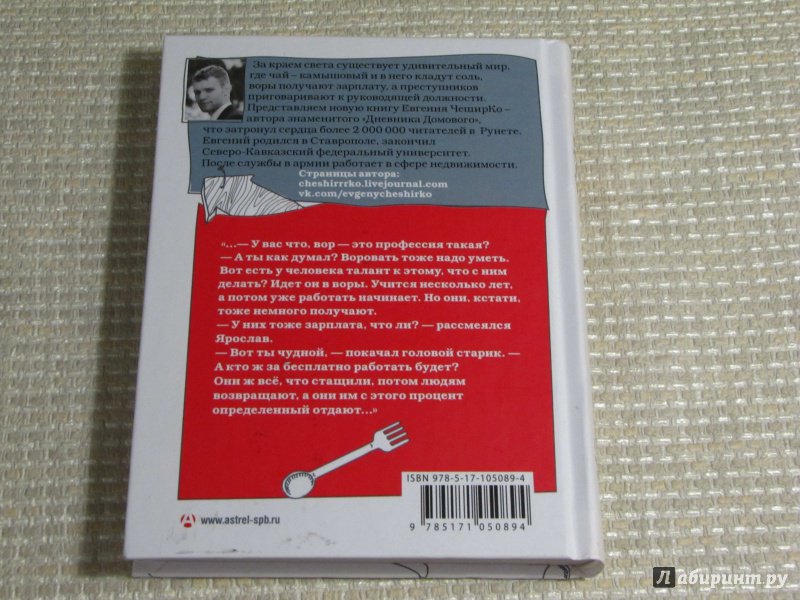 ОписаниеЗа краем света существует удивительный мир, где чай - камышовый и в него кладут соль, воры получают зарплату, а преступников приговаривают к руководящей должности. Новая книга Евгения ЧеширКо - автора знаменитого "Дневника Домового", что затронул сердца более 2 000 000 читателей в Рунете. Евгений родился в Ставрополе, закончил Северо-Кавказский федеральный университет. После службы в армии работает в сфере недвижимости.За краем света существует удивительный мир, где чай - камышовый и в него кладут соль, воры получают зарплату, а преступников приговаривают к руководящей должности. Новая книга Евгения ЧеширКо - автора знаменитого "Дневника Домового", что затронул сердца более 2 000 000 читателей в Рунете. Евгений родился в Ставрополе, закончил Северо-Кавказский федеральный университет. После службы в армии работает в сфере недвижимости.