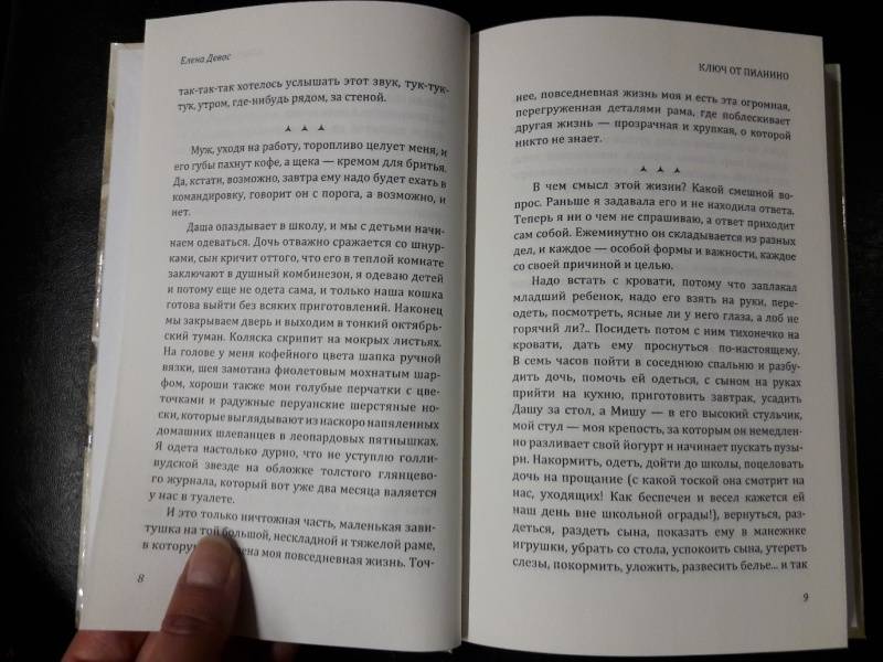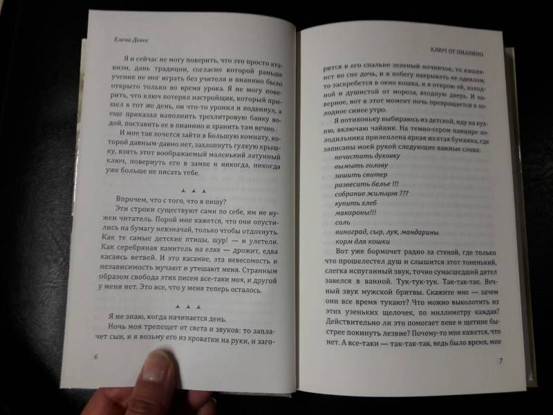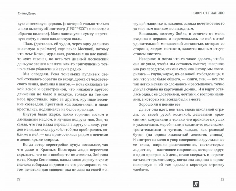 ОписаниеКогда-то в крышку каждого пианино врезали маленький замок и преподаватель-музыкант запирал инструмент на ключ, когда урок музыки заканчивался. А что еще можно открыть ключом от пианино? Может быть, воспоминания? Уходит ли вообще первая любовь? И если да, то куда уходит?Героиня романа "Ключ от пианино" Анна - французская домохозяйка, погруженная в свои хлопоты жены и матери. Но у нее есть другая жизнь, которую она и называет настоящей, и она разворачивается на страницах странных, почти исповедальных писем, которые Анна пишет уже больше года, но никогда никому не отправляет...Это история Ани Луткариной, девочки из русской провинции, которая влюбилась в столичного радиоведущего Владимира Вермана. История их романа, мучительного, ломаного, призрачного. История, состоящая из воспоминаний и писем, которые Аня-Анна, похоже, так и не перестанет писать никогда...Когда-то в крышку каждого пианино врезали маленький замок и преподаватель-музыкант запирал инструмент на ключ, когда урок музыки заканчивался. А что еще можно открыть ключом от пианино? Может быть, воспоминания? Уходит ли вообще первая любовь? И если да, то куда уходит?Героиня романа "Ключ от пианино" Анна - французская домохозяйка, погруженная в свои хлопоты жены и матери. Но у нее есть другая жизнь, которую она и называет настоящей, и она разворачивается на страницах странных, почти исповедальных писем, которые Анна пишет уже больше года, но никогда никому не отправляет...Это история Ани Луткариной, девочки из русской провинции, которая влюбилась в столичного радиоведущего Владимира Вермана. История их романа, мучительного, ломаного, призрачного. История, состоящая из воспоминаний и писем, которые Аня-Анна, похоже, так и не перестанет писать никогда...