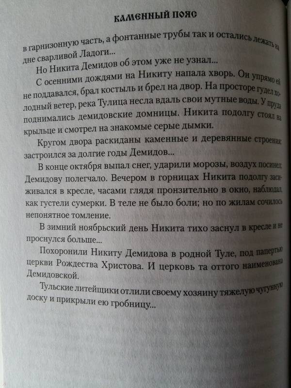 Описание"Каменный Пояс" - эпическое полотно, охватывающее период русской действительности от конца XVII века до 70-х годов XIX века. И хотя стержнем повествования служит история рода уральских горнозаводчиков Демидовых - от сметливого кузнеца Никиты, зачинателя "дела", до немощного, развращенного роскошью Анатолия, князя Сан-Донато, завершившего родословную, - главным героем трилогии является талантливый, трудолюбивый русский народ, терпеливый и мятежный.Автор создал целую галерею запоминающихся образов мастеровых людей, зримо предстают и Демидовы, жестокие, властолюбивые, гордые своей силой и властью над человеком.Роман "Демидовы" - первая книга трилогии.Зарождение русской промышленности на Урале. Талантливый тульский оружейник Никита Демидов благодаря покровительству Петра I начинает строительство горных заводов. Скупая за бесценок обширные земли, нещадно эксплуатируя крестьян, Демидов и его сыновья становятся хозяевами Каменного Пояса - Урала."Каменный Пояс" - эпическое полотно, охватывающее период русской действительности от конца XVII века до 70-х годов XIX века. И хотя стержнем повествования служит история рода уральских горнозаводчиков Демидовых - от сметливого кузнеца Никиты, зачинателя "дела", до немощного, развращенного роскошью Анатолия, князя Сан-Донато, завершившего родословную, - главным героем трилогии является талантливый, трудолюбивый русский народ, терпеливый и мятежный.Автор создал целую галерею запоминающихся образов мастеровых людей, зримо предстают и Демидовы, жестокие, властолюбивые, гордые своей силой и властью над человеком.Роман "Демидовы" - первая книга трилогии.Зарождение русской промышленности на Урале. Талантливый тульский оружейник Никита Демидов благодаря покровительству Петра I начинает строительство горных заводов. Скупая за бесценок обширные земли, нещадно эксплуатируя крестьян, Демидов и его сыновья становятся хозяевами Каменного Пояса - Урала.