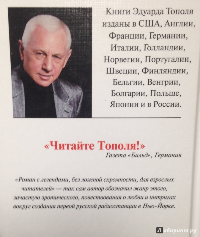 Описание«Роман с легендами, без ложной скромности, для взрослых читателей» — так сам автор обозначил жанр этого, зачастую эротического, повествования о любви и интригах вокруг создания первой русской радиостанции в Нью-Йорке.«Роман с легендами, без ложной скромности, для взрослых читателей» — так сам автор обозначил жанр этого, зачастую эротического, повествования о любви и интригах вокруг создания первой русской радиостанции в Нью-Йорке.