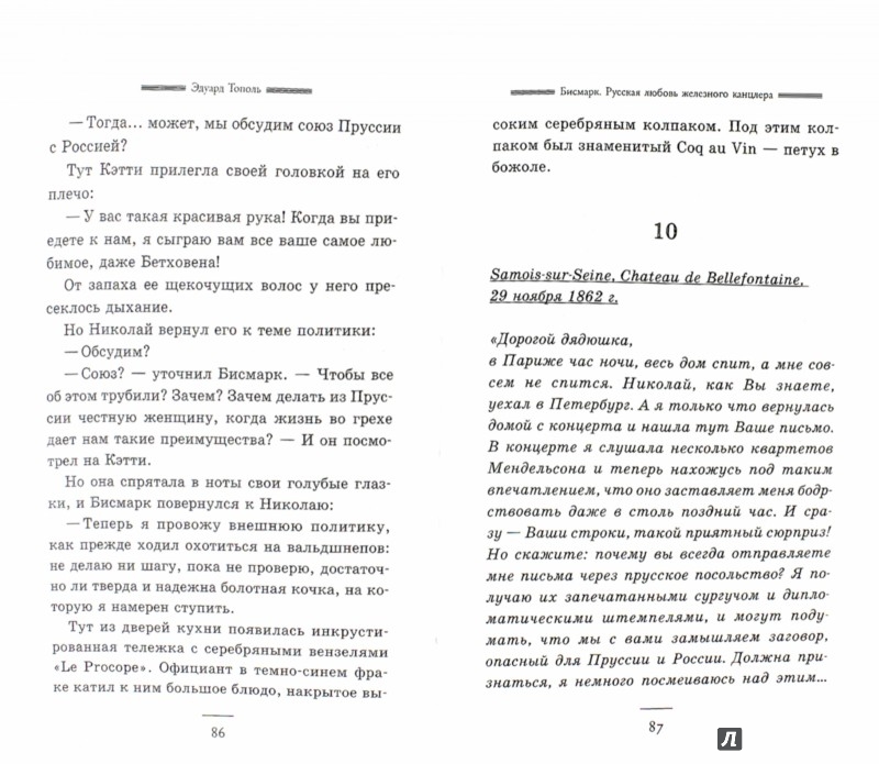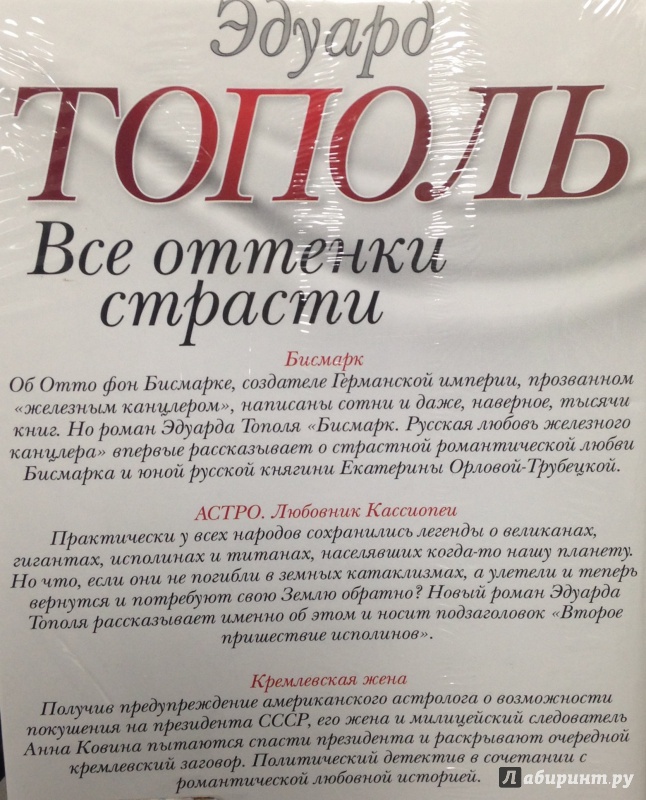 ОписаниеБисмарк. Русская любовь железного канцлера.Об Отто фон Бисмарке, создателе Германской империи, прозванном "железным канцлером", написаны сотни и даже, наверное, тысячи книг. Но роман Эдуарда Тополя "Русская любовь железного канцлера" впервые рассказывает о страстной романтической любви Бисмарка и юной русской княгини Екатерины Орловой-Трубецкой…Астро. Любовник Кассиопеи.Практически у всех народов сохранились легенды о великанах, гигантах, исполинах и титанах, населявших когда-то нашу планету. Но что если они не погибли в земных катаклизмах, а улетели, а теперь вернутся и потребуют свою Землю обратно? Новый роман Эдуарда Тополя рассказывает именно об этом и носит подзаголовок "Второе пришествие Исполинов".Кремлевская жена.Получив предупреждение американского астролога о возможности покушения на президента СССР, его жена и милицейский следователь Анна Ковина пытаются спасти президента и раскрывают очередной кремлевский заговор. Политический детектив в сочетании с романтической любовной историей.Элианна, подарок Бога."Роман с легендами, без ложной скромности, для взрослых читателей" - так сам автор обозначил жанр этого, зачастую эротического, повествования о любви и интригах вокруг создания первой русской радиостанции в Нью-Йорке.СвернутьБисмарк. Русская любовь железного канцлера.Об Отто фон Бисмарке, создателе Германской империи, прозванном "железным канцлером", написаны сотни и даже, наверное, тысячи книг. Но роман Эдуарда Тополя "Русская любовь железного канцлера" впервые рассказывает о страстной романтической любви Бисмарка и юной русской княгини Екатерины Орловой-Трубецкой…Астро. Любовник Кассиопеи.Практически у всех народов сохранились легенды о великанах, гигантах, исполинах и титанах, населявших когда-то нашу планету. Но что если они не погибли в земных катаклизмах, а улетели, а теперь вернутся и потребуют свою Землю обратно? Новый роман Эдуарда Тополя рассказывает именно об этом и носит подзаголовок "Второе пришествие Исполинов".Кремлевская жена.Получив предупреждение американского астролога о возможности покушения на президента СССР, его жена и милицейский следователь Анна Ковина пытаются спасти президента и раскрывают очередной кремлевский заговор. Политический детектив в сочетании с романтической любовной историей.Элианна, подарок Бога."Роман с легендами, без ложной скромности, для взрослых читателей" - так сам автор обозначил жанр этого, зачастую эротического, повествования о любви и интригах вокруг создания первой русской радиостанции в Нью-Йорке.СвернутьСвернуть
