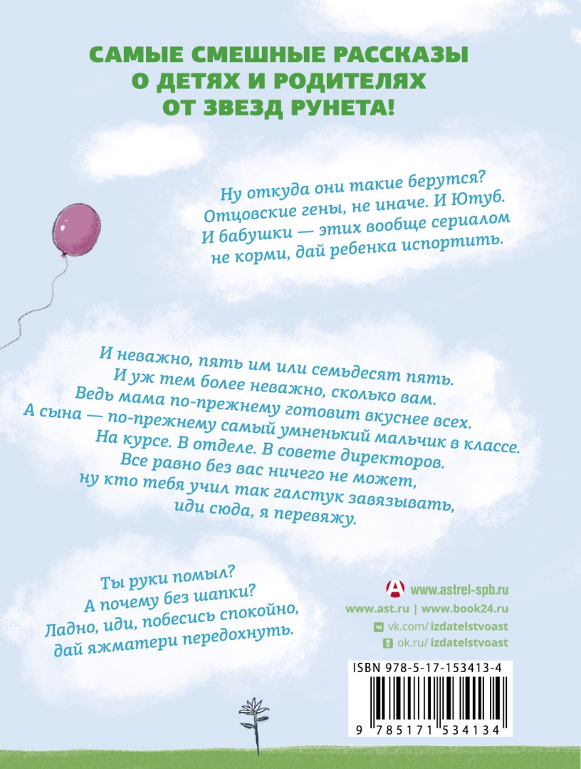 ОписаниеСамые смешные рассказы о детях и родителях от звезд Рунета!Ну откуда они такие берутся? Отцовские гены, не иначе. И Ютуб. И бабушки - этих вообще сериалом не корми, дай ребенка испортить.И неважно, пять им или семьдесят пять. И уж тем более неважно, сколько вам. Ведь мама по-прежнему готовит вкуснее всех. А сына - по-прежнему самый умненький мальчик в классе. На курсе. В отделе. В совете директоров. Все равно без вас ничего не может, ну кто тебя учил так галстук завязывать, иди сюда, я перевяжу.Ты руки помыл? А почему без шапки? Ладно, иди, побесись спокойно, дай яжматери передохнуть.Самые смешные рассказы о детях и родителях от звезд Рунета!Ну откуда они такие берутся? Отцовские гены, не иначе. И Ютуб. И бабушки - этих вообще сериалом не корми, дай ребенка испортить.И неважно, пять им или семьдесят пять. И уж тем более неважно, сколько вам. Ведь мама по-прежнему готовит вкуснее всех. А сына - по-прежнему самый умненький мальчик в классе. На курсе. В отделе. В совете директоров. Все равно без вас ничего не может, ну кто тебя учил так галстук завязывать, иди сюда, я перевяжу.Ты руки помыл? А почему без шапки? Ладно, иди, побесись спокойно, дай яжматери передохнуть.