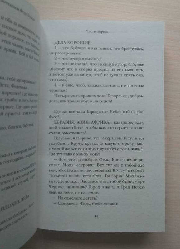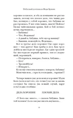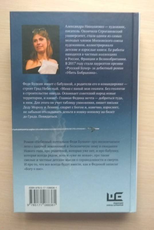 ОписаниеАлександра Николаенко - художник, писатель. Окончила Строгановский университет, стала одним из самых молодых членов Московского союза художников, иллюстрировала детские и взрослые книги. Ее работы находятся в частных коллекциях в России, Франции и Великобритании. В 2017 году стала лауреатом премии "Русский Букер" за дебютный роман "Убить Бобрыкина".Федя Булкин живет с бабушкой, а родители его в командировке - строят Град Небесный. "Мама с папой мои геологи. Без геологов в строительстве никуда. Осваивает советский народ новые территории, и какие!" Главная Федина мечта - добраться туда, к ним. Для этого он учит таблицу умножения, пишет письма Деду Морозу и Ленину, спорит с Богом и, конечно, взрослеет, не забывая откладывать деньги в кошку-копилку на билет до Града. Повидаться.Роман "Небесный почтальон Федя Булкин" про нескончаемое лето с пахучей земляникой и бесконечную зиму в ожидании Нового года, про родителей, которых уже нет, и про бабушку, которая всегда рядом, хоть и "уже не новая", про такие смелые и честные детские мысли о справедливости и смерти. И про то, что все всегда будут вместе, как в Фединой записке "Богу о нас".СвернутьАлександра Николаенко - художник, писатель. Окончила Строгановский университет, стала одним из самых молодых членов Московского союза художников, иллюстрировала детские и взрослые книги. Ее работы находятся в частных коллекциях в России, Франции и Великобритании. В 2017 году стала лауреатом премии "Русский Букер" за дебютный роман "Убить Бобрыкина".Федя Булкин живет с бабушкой, а родители его в командировке - строят Град Небесный. "Мама с папой мои геологи. Без геологов в строительстве никуда. Осваивает советский народ новые территории, и какие!" Главная Федина мечта - добраться туда, к ним. Для этого он учит таблицу умножения, пишет письма Деду Морозу и Ленину, спорит с Богом и, конечно, взрослеет, не забывая откладывать деньги в кошку-копилку на билет до Града. Повидаться.Роман "Небесный почтальон Федя Булкин" про нескончаемое лето с пахучей земляникой и бесконечную зиму в ожидании Нового года, про родителей, которых уже нет, и про бабушку, которая всегда рядом, хоть и "уже не новая", про такие смелые и честные детские мысли о справедливости и смерти. И про то, что все всегда будут вместе, как в Фединой записке "Богу о нас".СвернутьСвернуть