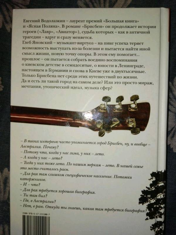 ОписаниеНовый роман Евгения Водолазкина, автора бестселлеров "Лавр" и "Авиатор".Где кончается слово, начинается музыкаЕвгений Водолазкин в своем новом романе "Брисбен" продолжает истории героев ("Лавр", "Авиатор"), судьба которых - как в античной трагедии - вдруг и сразу меняется.Глеб Яновский - музыкант-виртуоз - на пике успеха теряет возможность выступать из-за болезни и пытается найти иной смысл жизни, новую точку опоры. В этом ему помогает… прошлое - он пытается собрать воедино воспоминания о киевском детстве в семидесятые, о юности в Ленинграде, настоящем в Германии и снова в Киеве уже в двухтысячные.Только Брисбена нет среди этих путешествий по жизни. Да и есть ли такой город на самом деле? Или это просто мираж, мечтания, утопический идеал, музыка сфер?"К городу Брисбену, как и положено, роман не имеет никакого отношения, иначе я не назвал бы его так. Брисбен - это символ того, что находится на другой стороне земного шара, цель мечтаний, усилий, которая, конечно же, недостижима. Вообще это история современного успешного музыканта, который потерял возможность выступать и ищет новый смысл жизни. Прежде у него все было направлено на успех, на то верхнее "фа", которое он взял, но ему приходится признать, что смысл жизни не заключается в этой верхней точке". Евгений Водолазкин, интервью радио SputnikЦитата из книги: - В твоих интервью часто упоминается город Брисбен, ну, и вообще - Австралия. Почему?- Потому что, когда у нас зима, у них - лето.- А когда у нас - лето?- Тогда у них тоже лето. По нашим меркам - лето. Вот в чем вся штука, понимаешь? В нашей семье это место считалось раем.- Для рая там слишком специфическое население. Потомки каторжников.- И - что?- Для рая требуется хорошая биография.- Ты там был?- Где, в Австралии?- Нет, в раю. Откуда ты знаешь, какая там требуется биография?СвернутьНовый роман Евгения Водолазкина, автора бестселлеров "Лавр" и "Авиатор".Где кончается слово, начинается музыкаЕвгений Водолазкин в своем новом романе "Брисбен" продолжает истории героев ("Лавр", "Авиатор"), судьба которых - как в античной трагедии - вдруг и сразу меняется.Глеб Яновский - музыкант-виртуоз - на пике успеха теряет возможность выступать из-за болезни и пытается найти иной смысл жизни, новую точку опоры. В этом ему помогает… прошлое - он пытается собрать воедино воспоминания о киевском детстве в семидесятые, о юности в Ленинграде, настоящем в Германии и снова в Киеве уже в двухтысячные.Только Брисбена нет среди этих путешествий по жизни. Да и есть ли такой город на самом деле? Или это просто мираж, мечтания, утопический идеал, музыка сфер?"К городу Брисбену, как и положено, роман не имеет никакого отношения, иначе я не назвал бы его так. Брисбен - это символ того, что находится на другой стороне земного шара, цель мечтаний, усилий, которая, конечно же, недостижима. Вообще это история современного успешного музыканта, который потерял возможность выступать и ищет новый смысл жизни. Прежде у него все было направлено на успех, на то верхнее "фа", которое он взял, но ему приходится признать, что смысл жизни не заключается в этой верхней точке". Евгений Водолазкин, интервью радио SputnikЦитата из книги: - В твоих интервью часто упоминается город Брисбен, ну, и вообще - Австралия. Почему?- Потому что, когда у нас зима, у них - лето.- А когда у нас - лето?- Тогда у них тоже лето. По нашим меркам