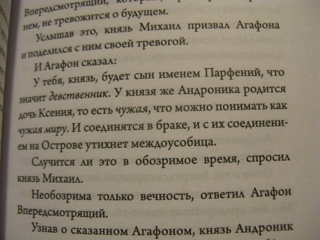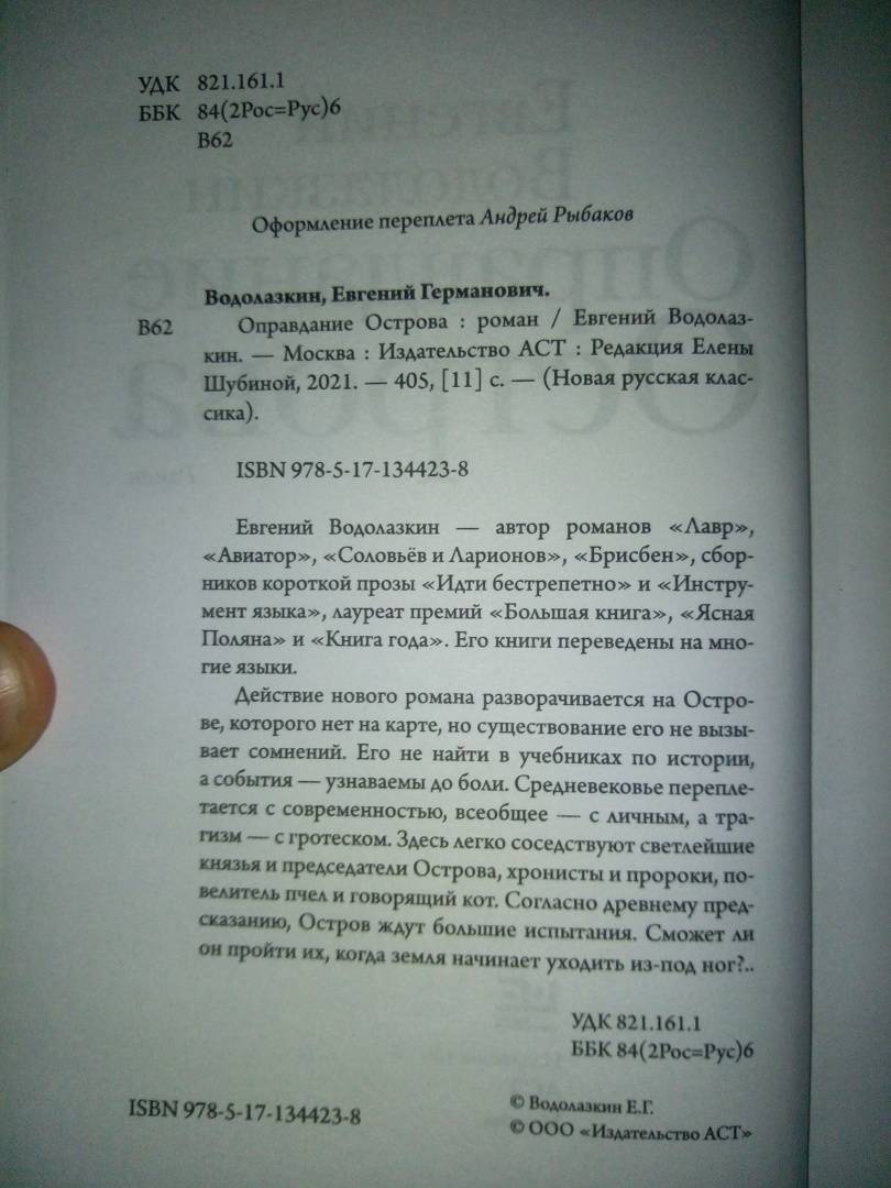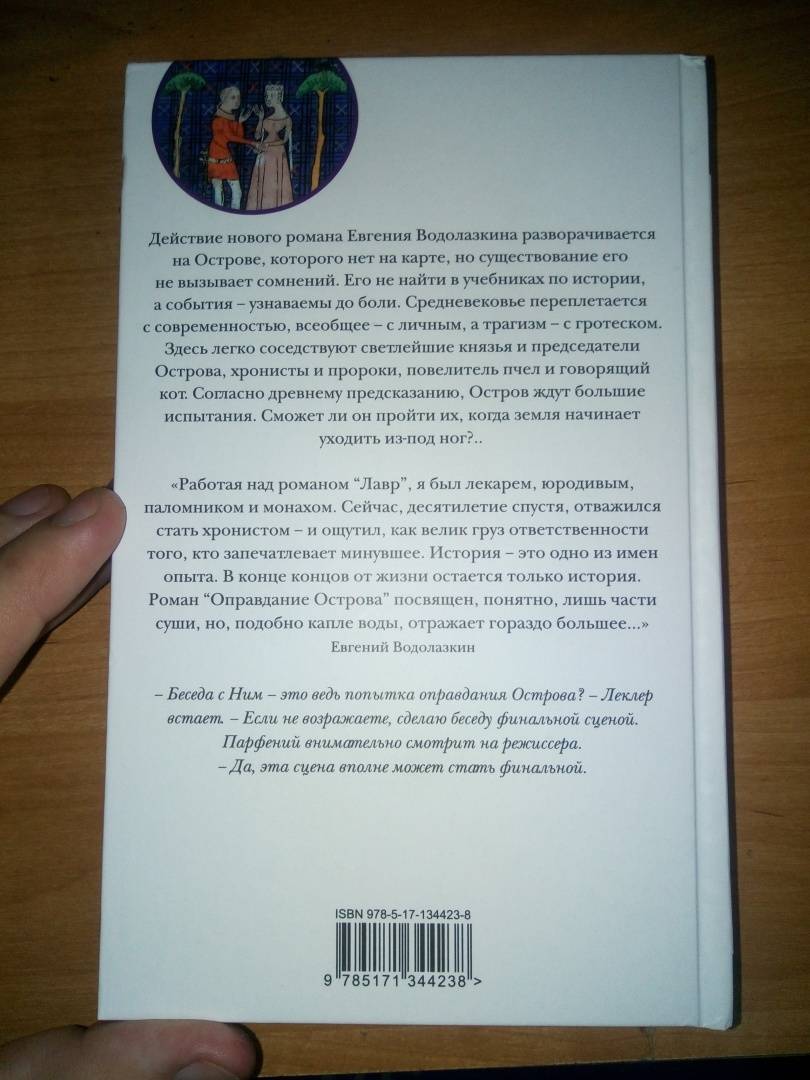 ОписаниеДействие нового романа Евгения Водолазкина разворачивается на Острове, которого нет на карте, но существование его не вызывает сомнений. Его не найти в учебниках по истории, а события — узнаваемы до боли. Средневековье переплетается с современностью, всеобщее – с личным, а трагизм – с гротеском. Здесь легко соседствуют светлейшие князья и председатели Острова, хронисты и пророки, повелитель пчел и говорящий кот. Согласно древнему предсказанию, Остров ждут большие испытания. Сможет ли он пройти их, когда земля начинает уходить из-под ног?..«Работая над романом “Лавр”, я был лекарем, юродивым, паломником и монахом. Сейчас, десятилетие спустя, отважился стать хронистом — и ощутил, как велик груз ответственности того, кто запечатлевает минувшее. История — это одно из имен опыта. В конце концов, от жизни остается только история. Роман “Оправдание Острова” посвящен, понятно, лишь части суши, но, подобно капле воды, отражает гораздо большее...»Евгений Водолазкин– Беседа с Ним – это ведь попытка оправдания Острова? – Леклерк встает. – Если не возражаете, сделаю беседу финальной сценой.Парфений внимательно смотрит на режиссера.– Да, эта сцена вполне может стать финальной.СвернутьДействие нового романа Евгения Водолазкина разворачивается на Острове, которого нет на карте, но существование его не вызывает сомнений. Его не найти в учебниках по истории, а события — узнаваемы до боли. Средневековье переплетается с современностью, всеобщее – с личным, а трагизм – с гротеском. Здесь легко соседствуют светлейшие князья и председатели Острова, хронисты и пророки, повелитель пчел и говорящий кот. Согласно древнему предсказанию, Остров ждут большие испытания. Сможет ли он пройти их, когда земля начинает уходить из-под ног?..«Работая над романом “Лавр”, я был лекарем, юродивым, паломником и монахом. Сейчас, десятилетие спустя, отважился стать хронистом — и ощутил, как велик груз ответственности того, кто запечатлевает минувшее. История — это одно из имен опыта. В конце концов, от жизни остается только история. Роман “Оправдание Острова” посвящен, понятно, лишь части суши, но, подобно капле воды, отражает гораздо большее...»Евгений Водолазкин– Беседа с Ним – это ведь попытка оправдания Острова? – Леклерк встает. – Если не возражаете, сделаю беседу финальной сценой.Парфений внимательно смотрит на режиссера.– Да, эта сцена вполне может стать финальной.СвернутьСвернуть