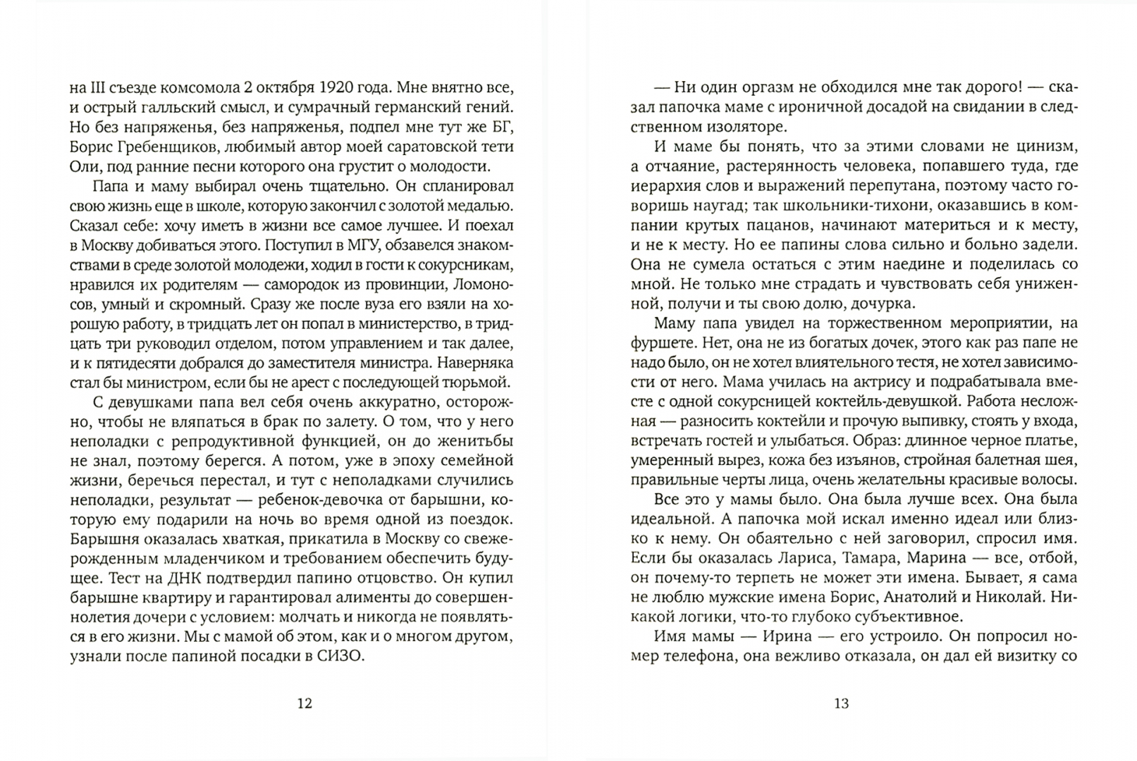 ОписаниеНовая книга прозаика и сценариста Алексея Слаповского состоит из романа и рассказов и демонстрирует виртуозное умение автора рассказывать истории, из которых получается кино. "Теперь, когда меня убили, я могу говорить все, что хочу и как хочу". Так начинается "потусторонняя история" 18-летней девушки, отца которой, очень крупного чиновника, поймали на взятке, судили и посадили в тюрьму. Героиня узнает все больше об отце, о матери, об их друзьях и знакомых, а потом уезжает, прямо по классику, "к тетке, в глушь, в Саратов", и там новое узнавание - людей из тех социальных слоев, с какими она раньше не пересекалась. На самом деле речь идет о вглядывании в себя и в мир - будто глаза открылись, будто она заново начала жить, замечая то, чего раньше не видела. "Дерево" - тоже история от первого лица. Шел весьма немолодой человек по улице мимо дерева, вспомнил, как залезал на него в детстве. Взял да и опять залез. И жизнь его после этого изменилась коренным образом. "Авария" - цикл из шести рассказов о людях, которые куда-то ехали, спешили, строили планы, и вот массовая автоавария, и время словно остановилось - и что теперь? Так ли всегда плохо попасть в подобную ситуацию или она может повернуть жизнь в лучшую сторону? Или хотя бы в иную? Таким образом авария - что-то вроде метафоры той самой пандемии, с которой столкнулись мы все.СвернутьНовая книга прозаика и сценариста Алексея Слаповского состоит из романа и рассказов и демонстрирует виртуозное умение автора рассказывать истории, из которых получается кино. "Теперь, когда меня убили, я могу говорить все, что хочу и как хочу". Так начинается "потусторонняя история" 18-летней девушки, отца которой, очень крупного чиновника, поймали на взятке, судили и посадили в тюрьму. Героиня узнает все больше об отце, о матери, об их друзьях и знакомых, а потом уезжает, прямо по классику, "к тетке, в глушь, в Саратов", и там новое узнавание - людей из тех социальных слоев, с какими она раньше не пересекалась. На самом деле речь идет о вглядывании в себя и в мир - будто глаза открылись, будто она заново начала жить, замечая то, чего раньше не видела. "Дерево" - тоже история от первого лица. Шел весьма немолодой человек по улице мимо дерева, вспомнил, как залезал на него в детстве. Взял да и опять залез. И жизнь его после этого изменилась коренным образом. "Авария" - цикл из шести рассказов о людях, которые куда-то ехали, спешили, строили планы, и вот массовая автоавария, и время словно остановилось - и что теперь? Так ли всегда плохо попасть в подобную ситуацию или она может повернуть жизнь в лучшую сторону? Или хотя бы в иную? Таким образом авария - что-то вроде метафоры той самой пандемии, с которой столкнулись мы все.СвернутьСвернуть