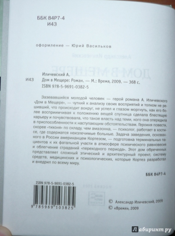 ОписаниеЗазевавшийся молодой человек - герой романа А. Иличевского "Дом в Мещере" - чуткий к анализу своих восприятий и толком не решивший, что происходит вокруг, не успел и глазом моргнуть, как его более восприимчивая к положению вещей спутница сделала блестящую карьеру и почувствовала, что такое власть над теми, кого она опередила в приспособленности к наступающим обстоятельствам. Героиня повести, скорее "тихоня" по складу, чем амазонка, - психолог, работает в хосписе, где содержатся неизлечимые больные, нашедшие средства обеспечить свои последние месяцы медицинским уходом. Задача заведения, основанного в России американцем Кортезом, - подготовка терминальных пациентов к их фатальной участи в атмосфере психического равновесия и облегчение страданий "переходного периода". Этот дом обреченных представляет сложный этический и архитектурный проект, систему средств, медицинских и психологических, которые Кортез разработал и внедрил по всему миру.Зазевавшийся молодой человек - герой романа А. Иличевского "Дом в Мещере" - чуткий к анализу своих восприятий и толком не решивший, что происходит вокруг, не успел и глазом моргнуть, как его более восприимчивая к положению вещей спутница сделала блестящую карьеру и почувствовала, что такое власть над теми, кого она опередила в приспособленности к наступающим обстоятельствам. Героиня повести, скорее "тихоня" по складу, чем амазонка, - психолог, работает в хосписе, где содержатся неизлечимые больные, нашедшие средства обеспечить свои последние месяцы медицинским уходом. Задача заведения, основанного в России американцем Кортезом, - подготовка терминальных пациентов к их фатальной участи в атмосфере психического равновесия и облегчение страданий "переходного периода". Этот дом обреченных представляет сложный этический и архитектурный проект, систему средств, медицинских и психологических, которые Кортез разработал и внедрил по всему миру.