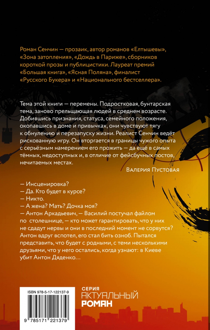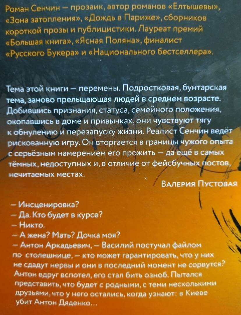ОписаниеРоман Сенчин — прозаик, автор романов «Елтышевы», «Зона затопления», «Дождь в Париже», сборников короткой прозы и публицистики. Лауреат премий «Большая книга», «Ясная Поляна», финалист «Русского Букера» и «Национального бестселлера».«Тема этой книги — перемены. Подростковая, бунтарская тема, заново прельщающая людей в среднем возрасте. Добившись признания, статуса, семейного положения, окопавшись в доме и привычках, они чувствуют тягу к обнулению и перезапуску жизни. Реалист Сенчин ведёт рискованную игру. Он вторгается в границы чужого опыта с серьёзным намерением его прожить — да ещё в самых тёмных, недоступных и, в отличие от фейсбучных постов, нечитаемых местах» Валерия Пустовая— Инсценировка?— Да. Кто будет в курсе?— Никто.— А жена? Мать? Дочка моя?— Антон Аркадьевич, — Василий постучал файлом по столешнице, — кто может гарантировать, что у них не сдадут нервы и они в последний момент не сорвутся?Антон вдруг вспотел, его стал бить озноб. Пытался представить, что будет с родными, с теми несколькими друзьями, что у него остались, когда узнают: в Киеве убит Антон Дяденко…"СвернутьРоман Сенчин — прозаик, автор романов «Елтышевы», «Зона затопления», «Дождь в Париже», сборников короткой прозы и публицистики. Лауреат премий «Большая книга», «Ясная Поляна», финалист «Русского Букера» и «Национального бестселлера».«Тема этой книги — перемены. Подростковая, бунтарская тема, заново прельщающая людей в среднем возрасте. Добившись признания, статуса, семейного положения, окопавшись в доме и привычках, они чувствуют тягу к обнулению и перезапуску жизни. Реалист Сенчин ведёт рискованную игру. Он вторгается в границы чужого опыта с серьёзным намерением его прожить — да ещё в самых тёмных, недоступных и, в отличие от фейсбучных постов, нечитаемых местах» Валерия Пустовая— Инсценировка?— Да. Кто будет в курсе?— Никто.— А жена? Мать? Дочка моя?— Антон Аркадьевич, — Василий постучал файлом по столешнице, — кто может гарантировать, что у них не сдадут нервы и они в последний момент не сорвутся?Антон вдруг вспотел, его стал бить озноб. Пытался представить, что будет с родными, с теми несколькими друзьями, что у него остались, когда узнают: в Киеве убит Антон Дяденко…"СвернутьСвернуть