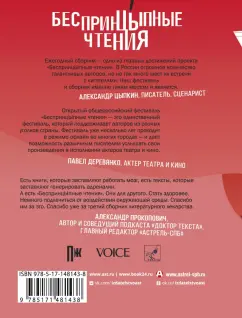 СвернутьАлександр Цыпкин, Константин Хабенский, Александр Бессонов, Александр Снегирёв, Александр Маленков и еще 15 авторов представляют лучшие рассказы нового сезона фестиваля "БеспринцЫпные чтения"! "Ежегодный сборник - одно из главных достижений проекта "БеспринцЫпные чтения". В России огромное количество талантливых авторов, но не так много мест их встречи с читателями. Наш фестиваль и сборник именно таким местом и является".Александр Цыпкин, писатель, сценарист "Открытый общероссийский фестиваль "БеспринцЫпные чтения" - это единственный фестиваль, который поддерживает авторов из разных уголков страны. Фестиваль уже несколько лет проходит в режиме офлайн во многих городах - и дает возможность различным писателям услышать свои произведения в исполнении актеров театра и кино".Павел Деревянко, актер театра и кино"Есть книги, которые заставляют работать мозг, есть тексты, которые заставляют генерировать адреналин. А есть "БеспринцЫпные чтения". Они для другого. Стать здоровее. Немного подлечиться от воздействия окружающей среды. Спасибо им за это. Спасибо уже за третий сборник литературного лекарства".Александр Прокопович, автор и соведущий подкаста "Доктор текста", главный редактор "Астрель-СПб"«БеспринцЫпные чтения» — это литературно-театральный проект, где талантливые авторы читают свои произведения, и где рассказы этих авторов читают актёры театра и кино.