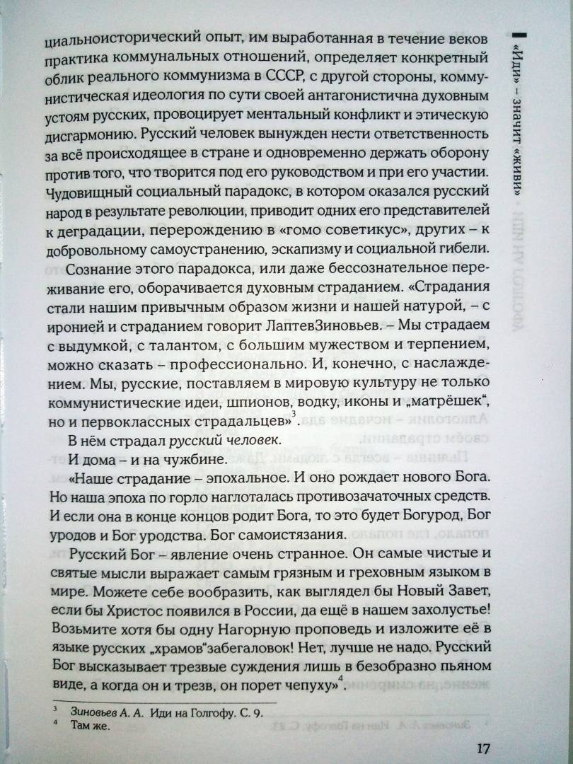 ОписаниеКлассик русской литературы, великий русский мыслитель Александр Александрович Зиновьев (1922 – 2006) оставил громадное творческое наследие, на осмысление которого нужен не один десяток лет, не одно поколение читателей. Эта книга продолжает выпуск полного собрания сочинений к 100-летию А.А. Зиновьева.В настоящий том вошли две философско-этические повести Александра Зиновьева «Иди на Голгофу» и «Живи», написанные в жанре социологического романа, основоположником которого он является. Программное литературное произведение «Иди на Голгофу» и повесть «Живи» очерчивают духовный путь русского человека в непростую эпоху, когда несмотря на мерзость бытия нужно было сохранить в себе личность и остаться духовно живым человеком. Здесь ответ на вопрос, как остаться личностью, несмотря ни на что – несмотря на неверие в свои силы, одиночество, пассивность, унижение человеческого достоинства, наличие зла в мире. Это русский способ выхода из духовного тупика современной цивилизации.Классик русской литературы, великий русский мыслитель Александр Александрович Зиновьев (1922 – 2006) оставил громадное творческое наследие, на осмысление которого нужен не один десяток лет, не одно поколение читателей. Эта книга продолжает выпуск полного собрания сочинений к 100-летию А.А. Зиновьева.В настоящий том вошли две философско-этические повести Александра Зиновьева «Иди на Голгофу» и «Живи», написанные в жанре социологического романа, основоположником которого он является. Программное литературное произведение «Иди на Голгофу» и повесть «Живи» очерчивают духовный путь русского человека в непростую эпоху, когда несмотря на мерзость бытия нужно было сохранить в себе личность и остаться духовно живым человеком. Здесь ответ на вопрос, как остаться личностью, несмотря ни на что – несмотря на неверие в свои силы, одиночество, пассивность, унижение человеческого достоинства, наличие зла в мире. Это русский способ выхода из духовного тупика современной цивилизации.