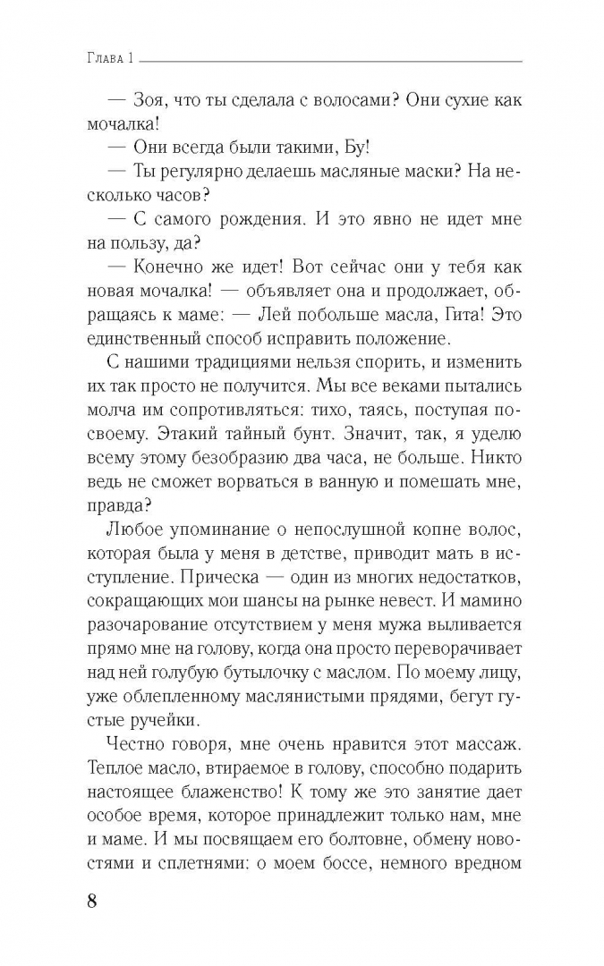 ОписаниеСемейство симпатичной пухленькой Зои, жительницы индийского мегаполиса, уверено: ей срочно нужно выйти замуж. И хоть сама девушка мечтает о профессиональном росте, она должна считаться с мнением старших. К тому же на церемонии росписи ладоней перед свадьбой кузины Зое достается хна невесты, а это верная примета грядущего замужества.И точно, благодаря стараниям тетушки вскоре находится достойный жених, и родственники вовсю форсируют подготовку к бракосочетанию...Но как же многообещающая карьера? Неужели придется поставить крест на стажировке в Нью-Йорке? К тому же прежде недоступный босс вдруг начинает поглядывать на Зою своими янтарными глазами и слать волнующие эсэмэски. Жизнь становится все интересней, вот только навязанный родней "суженый" превращается в серьезную помеху на пути к счастью.Семейство симпатичной пухленькой Зои, жительницы индийского мегаполиса, уверено: ей срочно нужно выйти замуж. И хоть сама девушка мечтает о профессиональном росте, она должна считаться с мнением старших. К тому же на церемонии росписи ладоней перед свадьбой кузины Зое достается хна невесты, а это верная примета грядущего замужества.И точно, благодаря стараниям тетушки вскоре находится достойный жених, и родственники вовсю форсируют подготовку к бракосочетанию...Но как же многообещающая карьера? Неужели придется поставить крест на стажировке в Нью-Йорке? К тому же прежде недоступный босс вдруг начинает поглядывать на Зою своими янтарными глазами и слать волнующие эсэмэски. Жизнь становится все интересней, вот только навязанный родней "суженый" превращается в серьезную помеху на пути к счастью.
