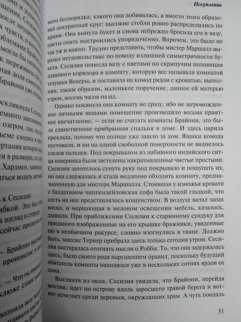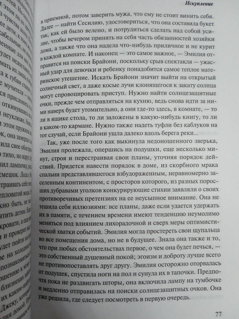 ОписаниеШорт-лист Букеровской премии 2001. "100 лучших романов всех времен" по версии журнала Time. Экранизация в 2007 году. В главных ролях: Кира Найтли, Джеймс МакЭвой и Сирша Ронан. Поразительная в своей искренности "хроника утраченного времени", которую ведет девочка-подросток, на свой причудливый и по-детски жестокий лад переоценивая и переосмысливая события "взрослой" жизни. Став свидетелем изнасилования, Брайони трактует его по-своему. Это приводит в действие цепочку роковых событий, которая аукнется самым неожиданным образом через много лет. "Великолепно… изящно… волшебно… прекрасно реализовано". - The Boston Sunday Globe Иэн Макьюэн - один из самых известных писателей Великобритании, автор "Амстердама", "Дитя во времени", "Невыносимой любви" и еще ряда известнейших произведений, за которые был удостоен Букеровской премии.Шорт-лист Букеровской премии 2001. "100 лучших романов всех времен" по версии журнала Time. Экранизация в 2007 году. В главных ролях: Кира Найтли, Джеймс МакЭвой и Сирша Ронан. Поразительная в своей искренности "хроника утраченного времени", которую ведет девочка-подросток, на свой причудливый и по-детски жестокий лад переоценивая и переосмысливая события "взрослой" жизни. Став свидетелем изнасилования, Брайони трактует его по-своему. Это приводит в действие цепочку роковых событий, которая аукнется самым неожиданным образом через много лет. "Великолепно… изящно… волшебно… прекрасно реализовано". - The Boston Sunday Globe Иэн Макьюэн - один из самых известных писателей Великобритании, автор "Амстердама", "Дитя во времени", "Невыносимой любви" и еще ряда известнейших произведений, за которые был удостоен Букеровской премии.