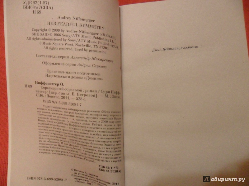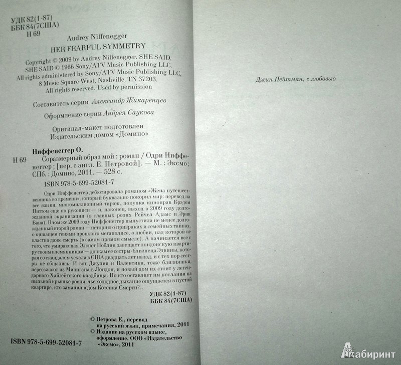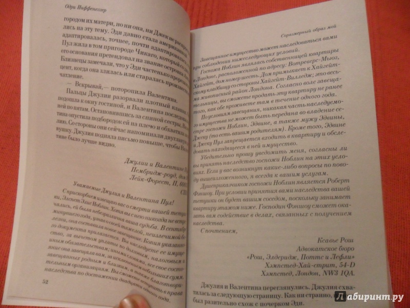ОписаниеОдри Ниффенеггер дебютировала романом "Жена путешественника во времени", который буквально покорил мир: перевод на все языки, многомиллионный тираж, покупка киноправ Брэдом Питтом еще по рукописи - и наконец выход в 2009 году долгожданной экранизации (в главных ролях Рейчел Адамс и Эрик Бана). В том же 2009 году Ниффенеггер выпустила не менее долгожданный второй роман - историю о призраках и семейных тайнах, о кишащем тенями прошлого мегаполисе, о любви, над которой не властна даже смерть (в самом прямом смысле). А начинается все с того, что умирающая Элспет Ноблин завещает лондонскую квартиру своим племянницам - дочкам ее сестры-близнеца Эдвины, которая со скандалом уехала в США двадцать лет назад, и с тех пор сестры не общались. И вот Джулия и Валентина, тоже близняшки, переезжают из Мичигана в Лондон, и новый дом их стоит у легендарного Хайгейтского кладбища. Но кто оставляет им послания на пыльной крышке рояля, чье холодное дыхание ощущается в пустой квартире, кто заманил в дом Котенка Смерти.СвернутьОдри Ниффенеггер дебютировала романом "Жена путешественника во времени", который буквально покорил мир: перевод на все языки, многомиллионный тираж, покупка киноправ Брэдом Питтом еще по рукописи - и наконец выход в 2009 году долгожданной экранизации (в главных ролях Рейчел Адамс и Эрик Бана). В том же 2009 году Ниффенеггер выпустила не менее долгожданный второй роман - историю о призраках и семейных тайнах, о кишащем тенями прошлого мегаполисе, о любви, над которой не властна даже смерть (в самом прямом смысле). А начинается все с того, что умирающая Элспет Ноблин завещает лондонскую квартиру своим племянницам - дочкам ее сестры-близнеца Эдвины, которая со скандалом уехала в США двадцать лет назад, и с тех пор сестры не общались. И вот Джулия и Валентина, тоже близняшки, переезжают из Мичигана в Лондон, и новый дом их стоит у легендарного Хайгейтского кладбища. Но кто оставляет им послания на пыльной крышке рояля, чье холодное дыхание ощущается в пустой квартире, кто заманил в дом Котенка Смерти.СвернутьСвернуть