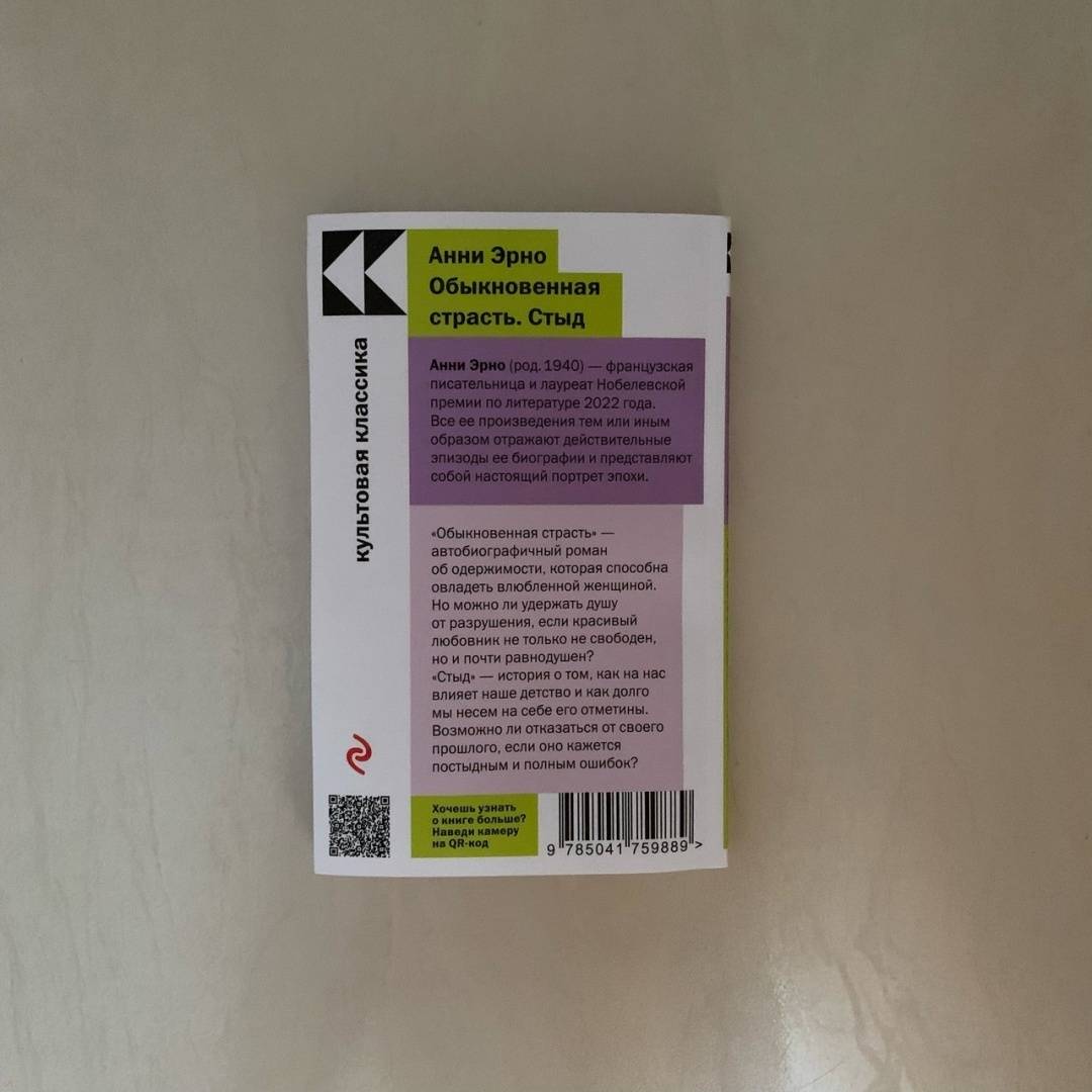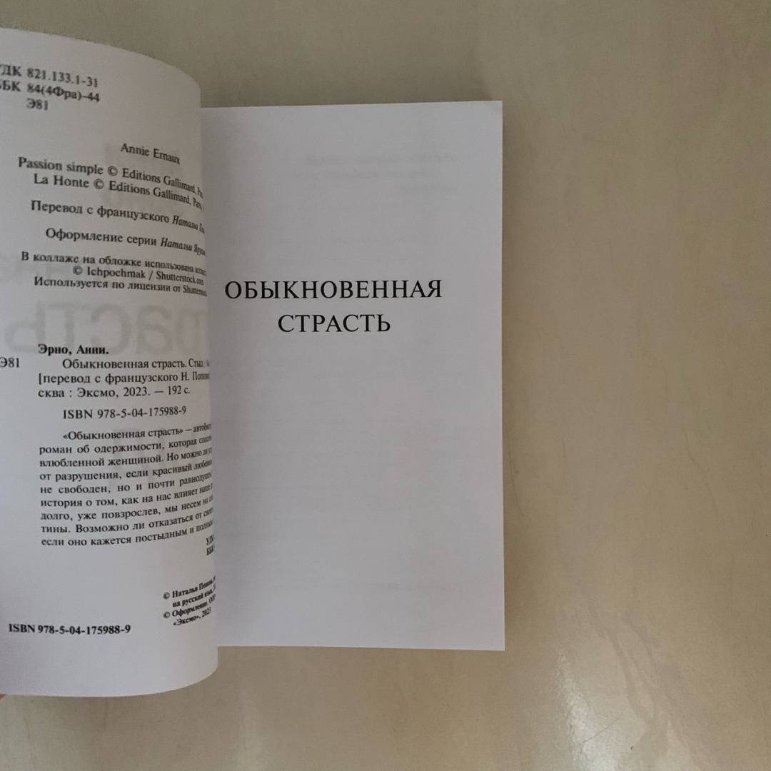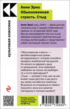 ОписаниеПод одной обложкой два романа лауреатки Нобелевской премии Анни Эрно. "Обыкновенная страсть" - автобиографический роман об одержимости мужчиной, которая заставляет женщину пренебрегать не только всем миром, но и собственной жизнью. Но что же на самом деле есть подобная страсть: проклятье или роскошь? Роман лег в основу одноименного франко-бельгийского фильма, вошедшего в программу Каннского фестиваля и Международного фестиваля в Сан-Себастьяне. "Стыд" - это воскрешенные на бумаге воспоминания о нравах послевоенной Нормандии, католической школе и обжигающем чувстве стыда за свое происхождение и окружение, которое в детстве ощущается как никогда.Под одной обложкой два романа лауреатки Нобелевской премии Анни Эрно. "Обыкновенная страсть" - автобиографический роман об одержимости мужчиной, которая заставляет женщину пренебрегать не только всем миром, но и собственной жизнью. Но что же на самом деле есть подобная страсть: проклятье или роскошь? Роман лег в основу одноименного франко-бельгийского фильма, вошедшего в программу Каннского фестиваля и Международного фестиваля в Сан-Себастьяне. "Стыд" - это воскрешенные на бумаге воспоминания о нравах послевоенной Нормандии, католической школе и обжигающем чувстве стыда за свое происхождение и окружение, которое в детстве ощущается как никогда.