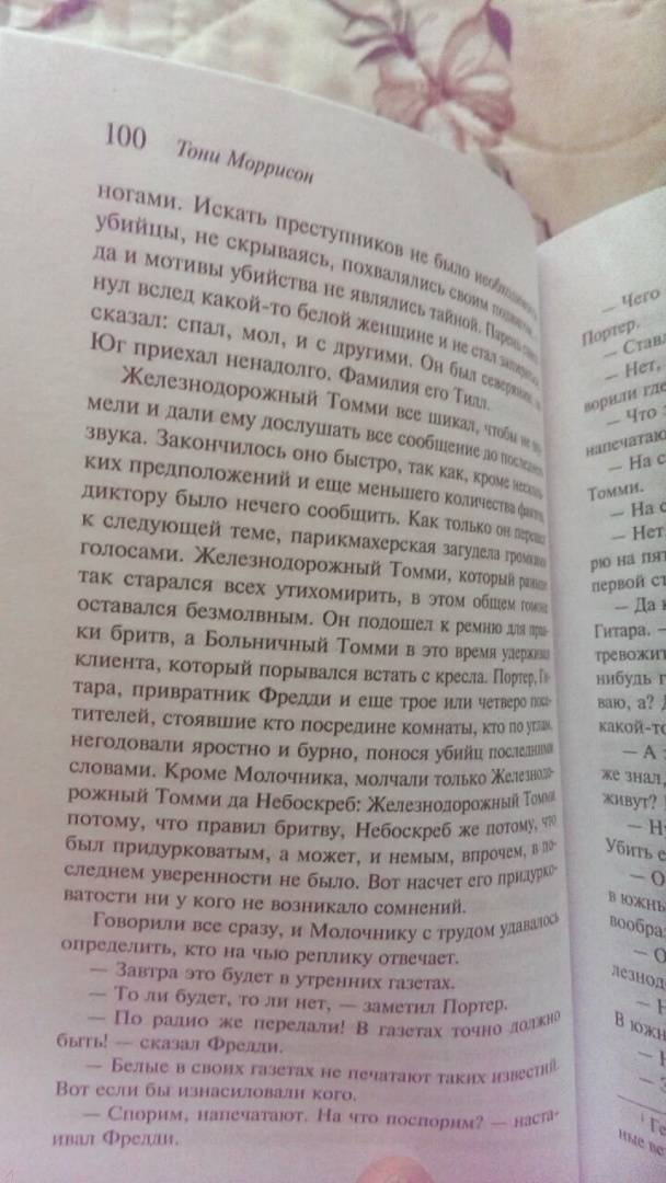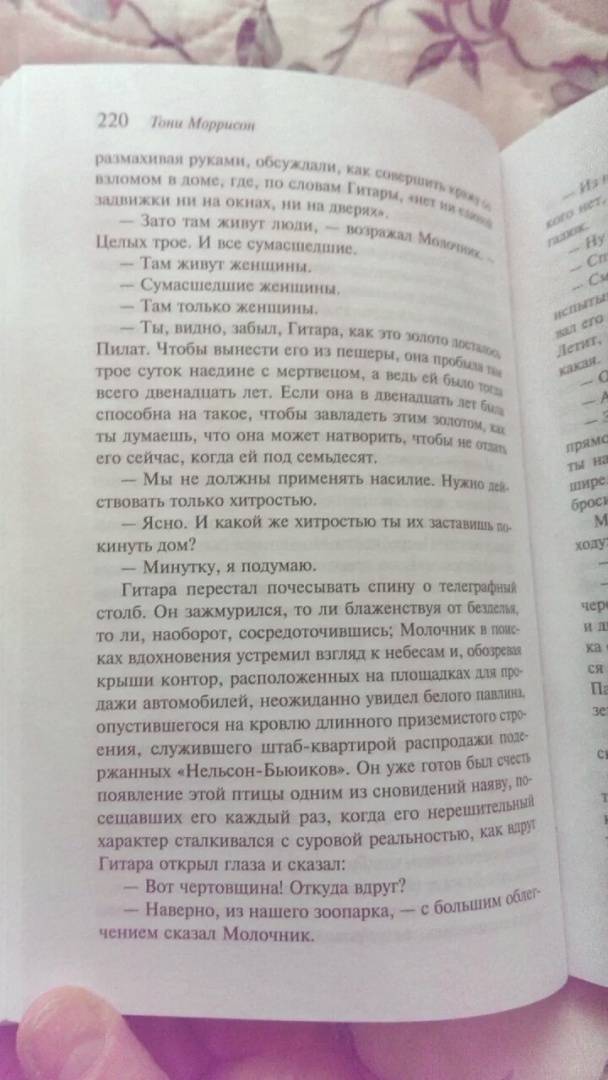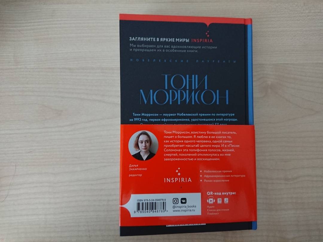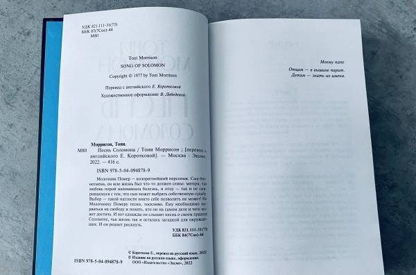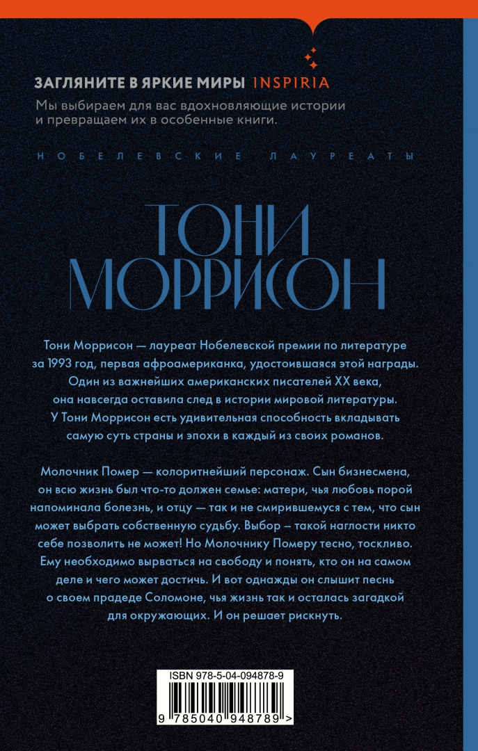 ОписаниеТони Моррисон - уже классик, первая писательница-афроамериканка, которая была удостоена Нобелевской премии. Каждый ее роман - ярчайший представитель современной американской литературы, ведь сквозь историю и поэтику она рисует истинную судьбу человека.Молочник Помер - колоритнейший персонаж. Сын бизнесмена, он всю жизнь был что-то должен семье: матери, чья любовь порой напоминала болезнь, и отцу - так и не смирившемуся с тем, что сын может выбрать собственную судьбу. Выбор - такой наглости никто себе позволить не может! Но Молочнику Померу тесно, тоскливо. Ему необходимо вырваться на свободу и понять, кто он на самом деле и чего может достичь. И вот однажды он слышит песнь о своем прадеде Соломоне, чья жизнь так и осталась загадкой для окружающих. И он решает рискнуть."Масштабный роман... многослойный и новаторский". - The New Yorker"Тони Моррисон оказалась в первом ряду современных американских писателей. Она написала роман, который выдержит испытание временем". - The Washington PostСвернутьТони Моррисон - уже классик, первая писательница-афроамериканка, которая была удостоена Нобелевской премии. Каждый ее роман - ярчайший представитель современной американской литературы, ведь сквозь историю и поэтику она рисует истинную судьбу человека.Молочник Помер - колоритнейший персонаж. Сын бизнесмена, он всю жизнь был что-то должен семье: матери, чья любовь порой напоминала болезнь, и отцу - так и не смирившемуся с тем, что сын может выбрать собственную судьбу. Выбор - такой наглости никто себе позволить не может! Но Молочнику Померу тесно, тоскливо. Ему необходимо вырваться на свободу и понять, кто он на самом деле и чего может достичь. И вот однажды он слышит песнь о своем прадеде Соломоне, чья жизнь так и осталась загадкой для окружающих. И он решает рискнуть."Масштабный роман... многослойный и новаторский". - The New Yorker"Тони Моррисон оказалась в первом ряду современных американских писателей. Она написала роман, который выдержит испытание временем". - The Washington PostСвернутьСвернуть