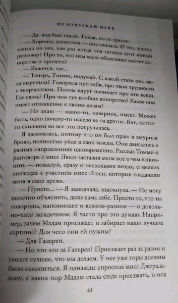 ОписаниеМногие говорят, что это их любимый роман Исигуро. Многие говорят, что это их любимый роман. «Не отпускай меня» оказался настоящим событием в мире литературы. Недаром через несколько лет после его публикации Исигуро получил Нобелевскую премию. Тридцатилетняя Кэти вспоминает свое детство в привилегированной школе Хейлшем, полное странных недомолвок, половинчатых откровений и подспудной угрозы. Она словно путешествует во времени, остро чувствуя произошедшие вокруг изменения, и рассказывает о том, что случилось. «Не отпускай меня» — это не просто история любви, дружбы и памяти, это история о предназначении, судьбе и несправедливости. А еще это роман-притча о настоящем и прошлом, вызывающий душевное смятение и боль. Боль, которая исцелит, но останется с вами надолго после прочтения. «Смело берясь, на свой привычный манер, за самый провокативный материал, Исигуро мастерски балансирует на грани между сочувствием и жестокостью, болью и удовольствием». — Booklist «Роман Исигуро подобен дзен-буддистскому саду, в котором ни цветистым метафорам, ни диким сорнякам не позволено заслонить сюжет». — The Globe and Mail «Это — роман-притча о «малых сих», о тех, кто находится внизу системы, глубоко в нее верит и верно ей служит. О нашем отношении к другим, к тем, кого мы используем и без кого наш комфорт не мог бы существовать. У Исигуро метафора "служить всей жизнью" предельно овеществлена…» — Русский журнал «Исигуро — вдохновенный певец утраты. К своим персонажам он относится с бесконечной теплотой, как бы те ни заблуждались или попадали впросак». — The Guardian «Исигуро — один из самых блестящих стилистов нашего времени». — Майкл Ондатже, автор «Английского пациента»СвернутьМногие говорят, что это их любимый роман Исигуро. Многие говорят, что это их любимый роман. «Не отпускай меня» оказался настоящим событием в мире литературы. Недаром через несколько лет после его публикации Исигуро получил Нобелевскую премию. Тридцатилетняя Кэти вспоминает свое детство в привилегированной школе Хейлшем, полное странных недомолвок, половинчатых откровений и подспудной угрозы. Она словно путешествует во времени, остро чувствуя произошедшие вокруг изменения, и рассказывает о том, что случилось. «Не отпускай меня» — это не просто история любви, дружбы и памяти, это история о предназначении, судьбе и несправедливости. А еще это роман-притча о настоящем и прошлом, вызывающий душевное смятение и боль. Боль, которая исцелит, но останется с вами надолго после прочтения. «Смело берясь, на свой привычный манер, за самый провокативный материал, Исигуро мастерски балансирует на грани между сочувствием и жестокостью, болью и удовольствием». — Booklist «Роман Исигуро подобен дзен-буддистскому саду, в котором ни цветистым метафорам, ни диким сорнякам не позволено заслонить сюжет». — The Globe and Mail «Это — роман-притча о «малых сих», о тех, кто находится внизу системы, глубоко в нее верит и верно ей служит. О нашем отношении к другим, к тем, кого мы используем и без кого наш комфорт не мог бы существовать. У Исигуро метафора "служить всей жизнью" предельно овеществлена…» — Русский журнал «Исигуро — вдохновенный певец утраты. К своим персонажам он относится с бесконечной теплотой, как бы те ни заблуждались или попадали впросак». — The Guardian «Исигуро — один из самых блестящих стилисто