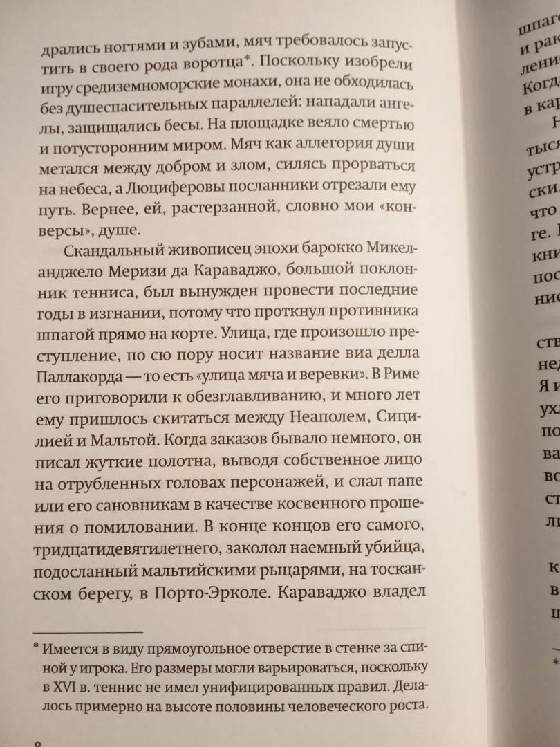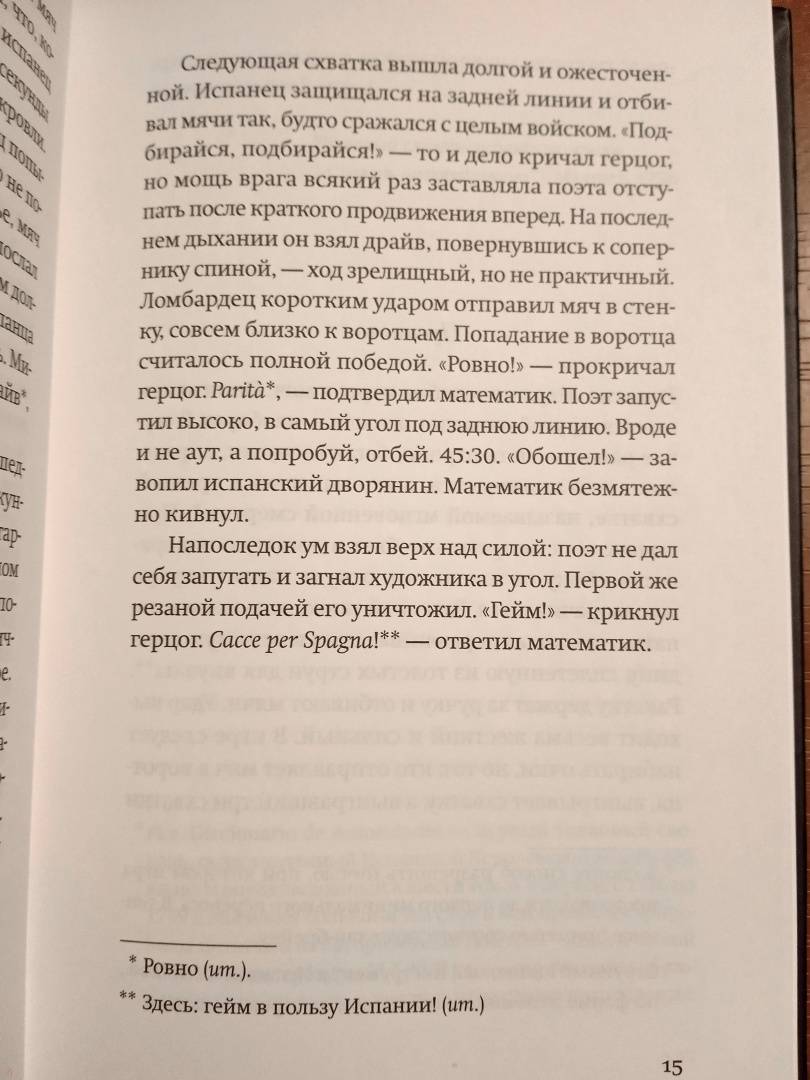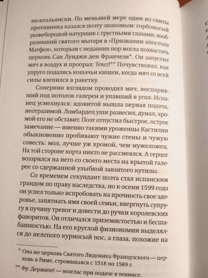 ОписаниеВ полдень 4 октября 1599 года на общественной теннисной площадке на пьяцца Навона в Риме встречаются два необычных соперника. Один - известный художник из Ломбардии, чье творчество навсегда изменит представления современников о живописи. Другой - молодой поэт, впоследствии ставший одним из столпов золотого века испанской литературы.Роман-приключение представляет знакомых героев (Галилея, Караваджо, Кеведо, Кортеса и многих других), какими мы их никогда не видели раньше, и бросает вызов всему, что мы знаем о европейском колониализме, истории, искусстве и современности.Книга удостоена престижной Премии Эрральде в Испании (2013), Международной премии Елены Понятовской в Мексике и Премии Барселоны. Переведена на несколько языков.Альваро Энриге (р. 1969) - писатель, литературный критик, издатель. Преподавал в Нью-Йоркском, Принстонском, Колумбийском университетах, в Университете Мэриленда. Родился в Гвадалахаре (Мексика), живет в Нью-Йорке.В полдень 4 октября 1599 года на общественной теннисной площадке на пьяцца Навона в Риме встречаются два необычных соперника. Один - известный художник из Ломбардии, чье творчество навсегда изменит представления современников о живописи. Другой - молодой поэт, впоследствии ставший одним из столпов золотого века испанской литературы.Роман-приключение представляет знакомых героев (Галилея, Караваджо, Кеведо, Кортеса и многих других), какими мы их никогда не видели раньше, и бросает вызов всему, что мы знаем о европейском колониализме, истории, искусстве и современности.Книга удостоена престижной Премии Эрральде в Испании (2013), Международной премии Елены Понятовской в Мексике и Премии Барселоны. Переведена на несколько языков.Альваро Энриге (р. 1969) - писатель, литературный критик, издатель. Преподавал в Нью-Йоркском, Принстонском, Колумбийском университетах, в Университете Мэриленда. Родился в Гвадалахаре (Мексика), живет в Нью-Йорке.
