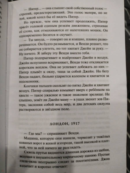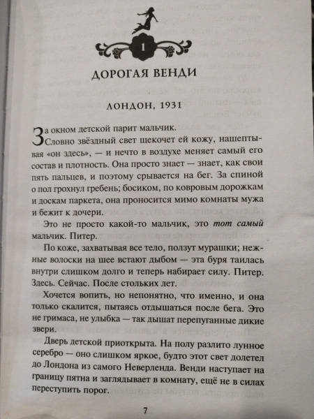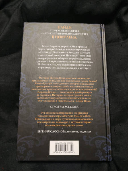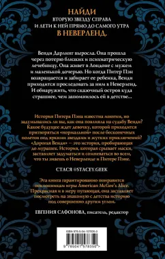 ОписаниеНайди вторую звезду справа и лети к ней прямо до самого утра в Неверленд: детский рай без правил, без взрослых. Только заколдованные леса и бесконечные приключения в компании мальчика, который умеет летать и никогда не вырастет.Венди Дарлинг повзрослела. Она прошла через потерю близких и психиатрическую лечебницу. Она живет в Лондоне с мужем и маленькой дочерью Джейн. Но однажды Питер Пэн снова появляется за её окном, чтобы найти новую маму для потерянных мальчишек. И вместо Венди он забирает Джейн.Теперь Венди придётся вернуться в Неверленд, чтобы спасти своего ребёнка. И обнаружить, что сказочный остров куда страшнее, чем запомнился ей в детстве…История Питера Пэна на более мрачный лад. Продолжение новой серии сказочных ретеллингов. Переосмысление всеми любимой сказки, потрясающие персонажи и пронзительная история о ценности семейных уз и материнской любви. Гарантированно понравится поклонникам всемирно известной видеоигры American McGee's Alice.Найди вторую звезду справа и лети к ней прямо до самого утра в Неверленд: детский рай без правил, без взрослых. Только заколдованные леса и бесконечные приключения в компании мальчика, который умеет летать и никогда не вырастет.Венди Дарлинг повзрослела. Она прошла через потерю близких и психиатрическую лечебницу. Она живет в Лондоне с мужем и маленькой дочерью Джейн. Но однажды Питер Пэн снова появляется за её окном, чтобы найти новую маму для потерянных мальчишек. И вместо Венди он забирает Джейн.Теперь Венди придётся вернуться в Неверленд, чтобы спасти своего ребёнка. И обнаружить, что сказочный остров куда страшнее, чем запомнился ей в детстве…История Питера Пэна на более мрачный лад. Продолжение новой серии сказочных ретеллингов. Переосмысление всеми любимой сказки, потрясающие персонажи и пронзительная история о ценности семейных уз и материнской любви. Гарантированно понравится поклонникам всемирно известной видеоигры American McGee's Alice.