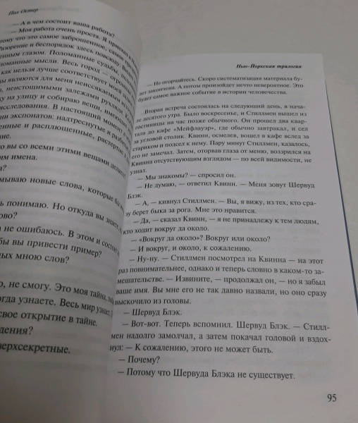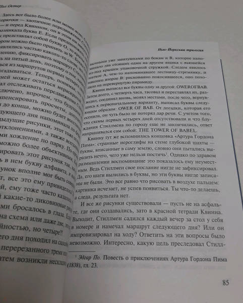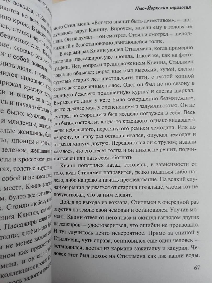 Описание"Нью-Йоркская трилогия" - блестящий дебют знаменитого Пола Остера, автора романов "4321" и "Бруклинские глупости". "Стеклянный город", "Призраки" и "Запертая комната" составляют краеугольный камень современного постмодернизма с человеческим лицом, вывернутый наизнанку детектив с философской подоплекой, романтичную трагикомедию масок. Случайный телефонный звонок вынуждает писателя Дэниела Квинна надеть на себя маску частного детектива по имени Пол Остер. Некто Белик нанимает частного детектива Синькина шпионить за человеком по фамилии Черни. Феншо бесследно исчез, оставив молодую жену с ребенком и рукопись романа "Небыляндия". Безымянный рассказчик не в силах справиться с искушением примерить на себя его роль."Нью-Йоркская трилогия" - блестящий дебют знаменитого Пола Остера, автора романов "4321" и "Бруклинские глупости". "Стеклянный город", "Призраки" и "Запертая комната" составляют краеугольный камень современного постмодернизма с человеческим лицом, вывернутый наизнанку детектив с философской подоплекой, романтичную трагикомедию масок. Случайный телефонный звонок вынуждает писателя Дэниела Квинна надеть на себя маску частного детектива по имени Пол Остер. Некто Белик нанимает частного детектива Синькина шпионить за человеком по фамилии Черни. Феншо бесследно исчез, оставив молодую жену с ребенком и рукопись романа "Небыляндия". Безымянный рассказчик не в силах справиться с искушением примерить на себя его роль.