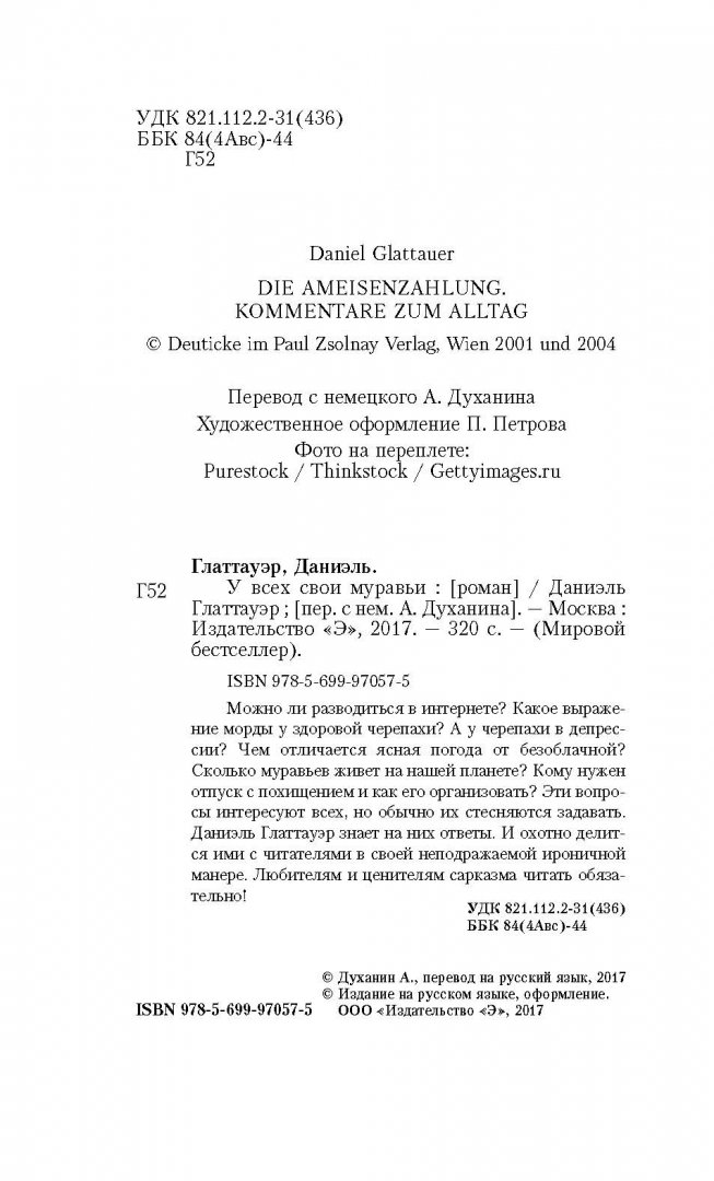 ОписаниеМожно ли разводиться в интернете? Какое выражение морды у здоровой черепахи? А у черепахи в депрессии? Чем отличается ясная погода от безоблачной? Сколько муравьев живет на нашей планете? Кому нужен отпуск с похищением и как его организовать? Эти вопросы интересуют всех, но обычно их стесняются задавать. Даниэль Глаттауэр знает на них ответы. И охотно делится ими с читателями в своей неподражаемой ироничной манере. Любителям и ценителям сарказма читать обязательно!Можно ли разводиться в интернете? Какое выражение морды у здоровой черепахи? А у черепахи в депрессии? Чем отличается ясная погода от безоблачной? Сколько муравьев живет на нашей планете? Кому нужен отпуск с похищением и как его организовать? Эти вопросы интересуют всех, но обычно их стесняются задавать. Даниэль Глаттауэр знает на них ответы. И охотно делится ими с читателями в своей неподражаемой ироничной манере. Любителям и ценителям сарказма читать обязательно!