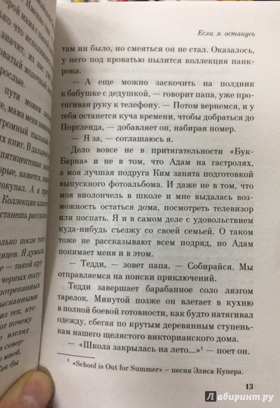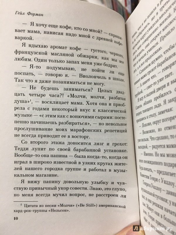 ОписаниеЭту книгу сравнивают с романом Элис Сиболд "Милые кости", самым поразительным бестселлером начала XXI века, по единодушному мнению критики. Хотя общая у них только канва: и здесь, и там душа юной девушки, расставшись с телом, наблюдает со стороны за жизнью близких людей. Но в случае с героиней книги Гейл Форман, семнадцатилетней Мией, дело обстоит много сложнее. Судьба поставила ее перед выбором - или вернуться к жизни, или навсегда уйти в мир иной, последовав за самыми любимыми для нее людьми.Эту книгу сравнивают с романом Элис Сиболд "Милые кости", самым поразительным бестселлером начала XXI века, по единодушному мнению критики. Хотя общая у них только канва: и здесь, и там душа юной девушки, расставшись с телом, наблюдает со стороны за жизнью близких людей. Но в случае с героиней книги Гейл Форман, семнадцатилетней Мией, дело обстоит много сложнее. Судьба поставила ее перед выбором - или вернуться к жизни, или навсегда уйти в мир иной, последовав за самыми любимыми для нее людьми.