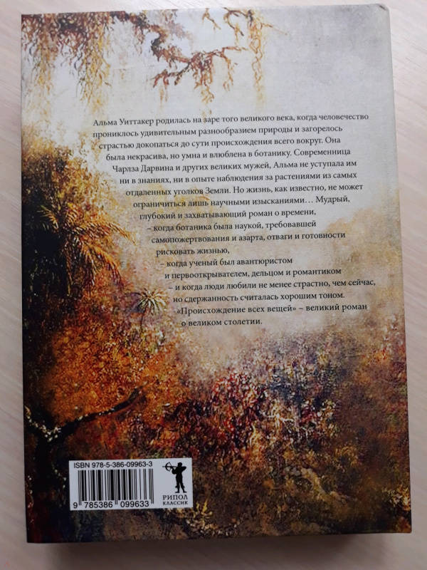 ОписаниеВремя действия: конец XVIII - конец XIX веков. Место действия: Лондон и Перу, Филадельфия и Таити, Амстердам и самые отдаленные уголки земли. Мудрый, глубокий и захватывающий роман о времени,- когда ботаника была наукой, требовавшей самопожертвования и азарта, отваги и готовности рисковать жизнью,- когда ученый был авантюристом и первооткрывателем, дельцом и романтиком,- когда люди любили не менее страстно, чем сейчас, но сдержанность считалась хорошим тоном."Происхождение всех вещей" - великий роман о великом столетии.Время действия: конец XVIII - конец XIX веков. Место действия: Лондон и Перу, Филадельфия и Таити, Амстердам и самые отдаленные уголки земли. Мудрый, глубокий и захватывающий роман о времени,- когда ботаника была наукой, требовавшей самопожертвования и азарта, отваги и готовности рисковать жизнью,- когда ученый был авантюристом и первооткрывателем, дельцом и романтиком,- когда люди любили не менее страстно, чем сейчас, но сдержанность считалась хорошим тоном."Происхождение всех вещей" - великий роман о великом столетии.