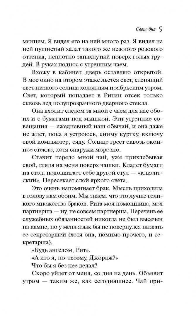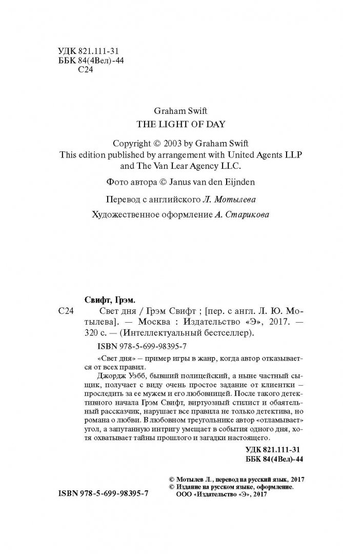 Описание"Свет дня" - пример игры в жанр, когда автор отказывается от всех правил.Джордж Уэбб, бывший полицейский, а ныне частный сыщик, получает с виду очень простое задание от клиентки - проследить за ее мужем и его любовницей. После такого детективного начала Грэм Свифт, виртуозный стилист и обаятельный рассказчик, нарушает все правила не только детектива, но романа о любви. В любовном треугольнике автор "отламывает" угол, а запутанную интригу умещает в события одного дня, хотя охватывает тайны прошлого и загадки настоящего."Свет дня" - пример игры в жанр, когда автор отказывается от всех правил.Джордж Уэбб, бывший полицейский, а ныне частный сыщик, получает с виду очень простое задание от клиентки - проследить за ее мужем и его любовницей. После такого детективного начала Грэм Свифт, виртуозный стилист и обаятельный рассказчик, нарушает все правила не только детектива, но романа о любви. В любовном треугольнике автор "отламывает" угол, а запутанную интригу умещает в события одного дня, хотя охватывает тайны прошлого и загадки настоящего.
