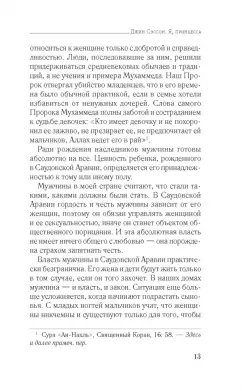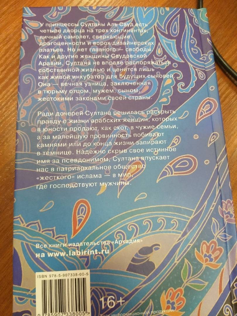ОписаниеУ принцессы Султаны Аль Сауд есть четыре дворца на трех континентах, личный самолет, сверкающие драгоценности и ворох дизайнерских платьев. Но нет главного - свободы. Как и другие женщины Саудовской Аравии, Султана не вправе распоряжаться собственной жизнью и ценится лишь как живой инкубатор для будущих сыновей. Она - вечная узница, заключенная в тюрьму отцом, мужем, сыном, жестокими законами своей страны.Ради дочерей Султана решилась раскрыть правду о жизни арабских женщин, которых в юности продают, как скот, в чужие семьи, а за малейшую провинность побивают камнями или до конца жизни запирают в темнице. Надежно скрыв свое истинное имя за псевдонимом, Султана впускает нас в патриархальное общество жесткого ислама - в мир, где господствуют мужчины.У принцессы Султаны Аль Сауд есть четыре дворца на трех континентах, личный самолет, сверкающие драгоценности и ворох дизайнерских платьев. Но нет главного - свободы. Как и другие женщины Саудовской Аравии, Султана не вправе распоряжаться собственной жизнью и ценится лишь как живой инкубатор для будущих сыновей. Она - вечная узница, заключенная в тюрьму отцом, мужем, сыном, жестокими законами своей страны.Ради дочерей Султана решилась раскрыть правду о жизни арабских женщин, которых в юности продают, как скот, в чужие семьи, а за малейшую провинность побивают камнями или до конца жизни запирают в темнице. Надежно скрыв свое истинное имя за псевдонимом, Султана впускает нас в патриархальное общество жесткого ислама - в мир, где господствуют мужчины.