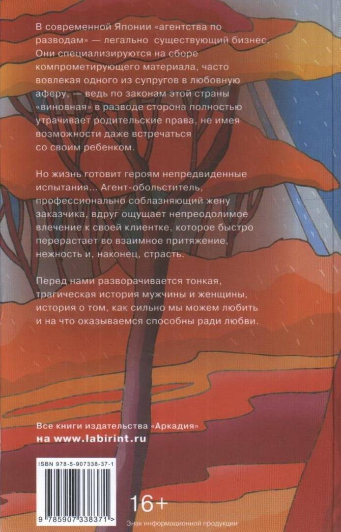 ОписаниеВ современной Японии "агентства по разводам" - легально существующий бизнес. Они специализируются на сборе компрометирующего материала, часто вовлекая одного из супругов в любовную аферу, - ведь по законам этой страны "виновная" в разводе сторона полностью утрачивает родительские права, не имея возможности даже встречаться со своим ребенком. Но жизнь готовит героям непредвиденные испытания… Агент-обольститель, профессионально соблазняющий жену заказчика, вдруг ощущает непреодолимое влечение к своей клиентке, которое быстро перерастает во взаимное притяжение, нежность и, наконец, страсть. Перед нами разворачивается тонкая, трагическая история мужчины и женщины, история о том, как сильно мы можем любить и на что оказываемся способны ради любви.В современной Японии "агентства по разводам" - легально существующий бизнес. Они специализируются на сборе компрометирующего материала, часто вовлекая одного из супругов в любовную аферу, - ведь по законам этой страны "виновная" в разводе сторона полностью утрачивает родительские права, не имея возможности даже встречаться со своим ребенком. Но жизнь готовит героям непредвиденные испытания… Агент-обольститель, профессионально соблазняющий жену заказчика, вдруг ощущает непреодолимое влечение к своей клиентке, которое быстро перерастает во взаимное притяжение, нежность и, наконец, страсть. Перед нами разворачивается тонкая, трагическая история мужчины и женщины, история о том, как сильно мы можем любить и на что оказываемся способны ради любви.