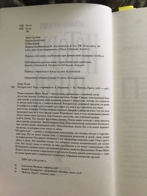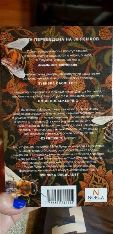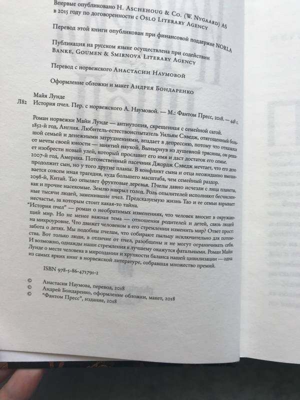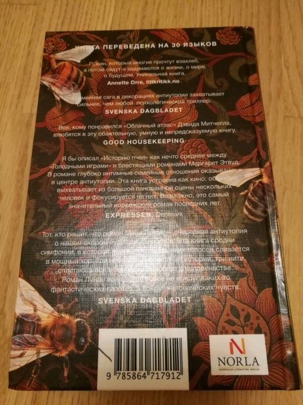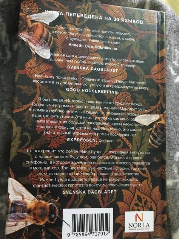 ОписаниеКнига переведена на 30 языков.Роман норвежки Майи Лунде - антиутопия, скрещенная с семейной сагой.1852-й год, Англия. Любитель-естествоиспытатель Уильям Сэведж, отягощенный большой семьей и денежными затруднениями, впадает в депрессию, потому что отказался от мечты своей юности - занятий наукой. Вынырнув из душевной трясины, он решает изобрести новый улей, который прославит его имя и даст достаток его семье.2007-й год, Америка. Потомственный пасечник Джордж Сэведж мечтает, что его дело продолжит сын, но у того другие планы. В конфликт сына и отца неожиданно вмешивается совсем иная трагедия, куда большего масштаба, чем семейный раздор.2098-й, Китай. Тао опыляет фруктовые деревья. Пчелы давно исчезли с лица планеты, как и прочие насекомые. Землю накрыл голод. Роль опылителей исполняют бесчисленные тысячи людей, заменившие пчел. Предсказуемую жизнь Тао и ее семьи взрывает несчастье, за которым стоит какая-то тайна."История пчел" - роман о необратимых изменениях, что человек вносит в окружающий мир. Но не менее важная тема - отношения родителей и детей, связь людей на микроуровне. Что движет человеком в его стремлении изменить мир? Ответ прост: забота о детях. Мы подобны пчелам, что собирают пыльцу исключительно для потомства. Вот только люди, в отличие от пчел, разобщены и не могут ограничивать себя. И возможно, однажды наши стремления к лучшему окажутся фатальными. Роман Майи Лунде о месте человека в мироздании и хрупкости баланса нашей цивилизации - одна из самых ярких книг в норвежской литературе, собравшая множество премий. "История пчел" - первая книга амбициозного "Климатического квартета" - тетралогии о месте человека в мироздании и хрупкости баланса нашей цивилизации. Это один из самых громких норвежских романов последнего десятилетия, собравший богатый урожай национальных литературных премий, ставший национальным бестселлером и в Норвегии, и во многих европейских странах. Антиутопия, скрещенная с семейной сагой и философским романом. В 2017-м году книга стала в Германии безоговорочным бестселлером №1, опередив и книги всех немецких авторов, и таких коммерческих тяжеловесов, как новый роман Дэна Брауна. Когда я начала работать над своим вторым романом "Синева", который был опубликован в самом конце 2017-го года, мне сразу стало очевидно, что я не завершила то, что начала рассказывать в "Истории пчел". Мне стало предельно ясно: жизни Тао, Уильяма и Джорджа, героев "Истории пчел" являются частью чего-то большего, гораздо большего. И вскоре вызрело понимание, что полная история уложится в четыре книги. Рассказ, который, когда он будет завершен, заполнит четыре тома, который я сразу назвала для себя "Климатический квартет". Это будут четыре очень разных, совершенно независимых друг от друга книги, каждая из которых будет посвящена осмыслению одной темы - что для нас, людей, и для нашей планеты в целом значат насекомые, вода, звери и наконец, растения. При этом каждая книга будет вращаться вокруг отдельных человеческих судеб. Я хотела бы написать большое полотно о нашем будущем, высветив на нем несколько людей и на примере их истории рассказав о глобальных проблемах нашего вида. В каждом романе будет несколько линий, несколько параллельных сюжетов - современных, развивающихся в недавнем прошлом и скором будущем. Все четыре книги будут посв