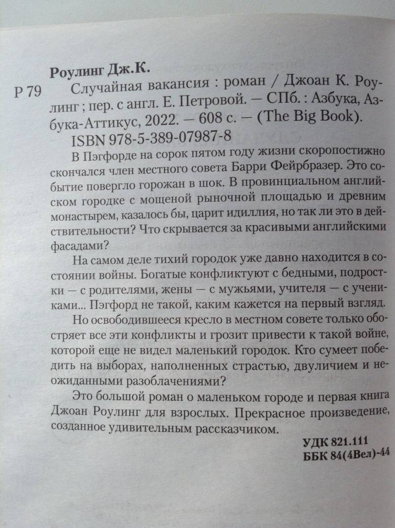 ОписаниеВ Пэгфорде на сорок пятом году жизни скоропостижно скончался член местного совета Барри Фейрбразер. Это событие повергло горожан в шок. В провинциальном английском городке с мощеной рыночной площадью и древним монастырем, казалось бы, царит идиллия, но так ли это на самом деле? Что скрывается за красивыми английскими фасадами?На самом деле тихий городок уже давно находится в состоянии войны. Богатые конфликтуют с бедными, подростки - с родителями, жены - с мужьями, учителя - с учениками... Пэгфорд не такой, каким кажется на первый взгляд.Но освободившееся кресло в местном совете только обостряет все эти конфликты и грозит привести к такой войне, которой еще не видел маленький городок. Кто сумеет победить на выборах, наполненных страстью, двуличием и неожиданными разоблачениями?Это большой роман о маленьком городе и первая книга Джоан Роулинг для взрослых. Прекрасное произведение, созданное удивительным рассказчиком.В Пэгфорде на сорок пятом году жизни скоропостижно скончался член местного совета Барри Фейрбразер. Это событие повергло горожан в шок. В провинциальном английском городке с мощеной рыночной площадью и древним монастырем, казалось бы, царит идиллия, но так ли это на самом деле? Что скрывается за красивыми английскими фасадами?На самом деле тихий городок уже давно находится в состоянии войны. Богатые конфликтуют с бедными, подростки - с родителями, жены - с мужьями, учителя - с учениками... Пэгфорд не такой, каким кажется на первый взгляд.Но освободившееся кресло в местном совете только обостряет все эти конфликты и грозит привести к такой войне, которой еще не видел маленький городок. Кто сумеет победить на выборах, наполненных страстью, двуличием и неожиданными разоблачениями?Это большой роман о маленьком городе и первая книга Джоан Роулинг для взрослых. Прекрасное произведение, созданное удивительным рассказчиком.