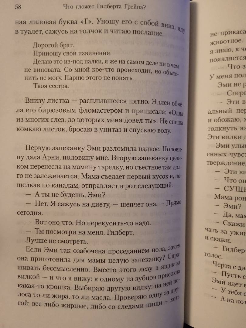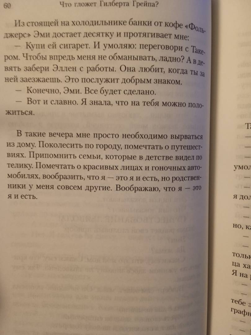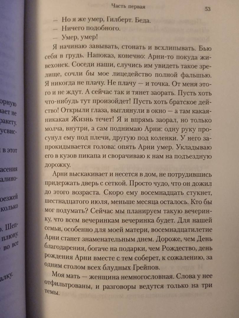 ОписаниеВпервые на русском - дебютный роман культового американского писателя и сценариста Питера Хеджеса, основа одноименного фильма Лассе Хальстрёма ("АББА", "Правила виноделов", "Шоколад", "Хатико") с Джонни Деппом и Леонардом ДиКаприо в главных ролях; за роль Арни Грейпа юный ДиКаприо получил первую свою номинацию на "Оскар", а оператором картины выступил легендарный Свен Нюквист, постоянный оператор Ингмара Бергмана.Двадцатичетырехлетний Гилберт Грейп работает продавцом в продуктовой лавке и живет в городе Эндора, штат Айова (население - 1091 человек), где его гложет примерно все. Он бы и рад куда-нибудь уехать, но дома его держат неподъемная (в буквальном смысле) мать, и младший брат с проблемами развития, и сестра, до сих пор оплакивающая смерть Элвиса, и давний роман с женщиной старше него. И вот однажды на летние каникулы в Эндору приезжает загадочная красавица, которая, раскатывая по городу на велосипеде, кружит головы всем парням и которая перевернет мир Гилберта вверх тормашками…"Свежий, искренний роман взросления - и в то же время элегия неудачникам и аутсайдерам, оказывающимся на обочине Американской Мечты. Словно фильм Дэвида Линча, оформленный нашими местными художниками-примитивистами" (The New York Times).СвернутьВпервые на русском - дебютный роман культового американского писателя и сценариста Питера Хеджеса, основа одноименного фильма Лассе Хальстрёма ("АББА", "Правила виноделов", "Шоколад", "Хатико") с Джонни Деппом и Леонардом ДиКаприо в главных ролях; за роль Арни Грейпа юный ДиКаприо получил первую свою номинацию на "Оскар", а оператором картины выступил легендарный Свен Нюквист, постоянный оператор Ингмара Бергмана.Двадцатичетырехлетний Гилберт Грейп работает продавцом в продуктовой лавке и живет в городе Эндора, штат Айова (население - 1091 человек), где его гложет примерно все. Он бы и рад куда-нибудь уехать, но дома его держат неподъемная (в буквальном смысле) мать, и младший брат с проблемами развития, и сестра, до сих пор оплакивающая смерть Элвиса, и давний роман с женщиной старше него. И вот однажды на летние каникулы в Эндору приезжает загадочная красавица, которая, раскатывая по городу на велосипеде, кружит головы всем парням и которая перевернет мир Гилберта вверх тормашками…"Свежий, искренний роман взросления - и в то же время элегия неудачникам и аутсайдерам, оказывающимся на обочине Американской Мечты. Словно фильм Дэвида Линча, оформленный нашими местными художниками-примитивистами" (The New York Times).СвернутьСвернуть