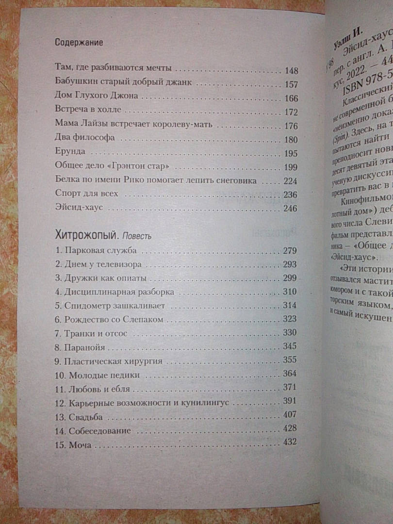 ОписаниеКлассический сборник "неоспоримого лидера в новой волне современной британской словесности" (Observer), который "неизменно доказывает, что литература - лучший наркотик" (Spin). Здесь, на темной изнанке Эдинбурга, потерянные люди пытаются найти хоть какую-то опору, но жизнь каждый раз преподносит новый сюрприз: то лифт увезет на минус восемьдесят девятый этаж, то коллега-философ предложит разрешить ученую дискуссию мордобоем, а то сам Господь Бог пригрозит превратить вас в муху... Кинофильмом "Эйсид-хаус" (в русском прокате - "Кислотный дом") дебютировал будущий постановщик "Счастливого числа Слевина" и телесериала "Шерлок" Пол Макгиган; фильм представляет собой экранизацию трех рассказов сборника - "Общее дело "Грэнтон стар"", "Рохля" и собственно "Эйсид-хаус"."Эти истории написаны с такой невероятной энергией, - отзывался маститый Джонатан Коу, - с таким безжалостным юмором и с такой бездной сочувствия, изложены таким новаторским языком, выстроены настолько революционно, что и самый искушенный читатель не избежит потрясения".СвернутьКлассический сборник "неоспоримого лидера в новой волне современной британской словесности" (Observer), который "неизменно доказывает, что литература - лучший наркотик" (Spin). Здесь, на темной изнанке Эдинбурга, потерянные люди пытаются найти хоть какую-то опору, но жизнь каждый раз преподносит новый сюрприз: то лифт увезет на минус восемьдесят девятый этаж, то коллега-философ предложит разрешить ученую дискуссию мордобоем, а то сам Господь Бог пригрозит превратить вас в муху... Кинофильмом "Эйсид-хаус" (в русском прокате - "Кислотный дом") дебютировал будущий постановщик "Счастливого числа Слевина" и телесериала "Шерлок" Пол Макгиган; фильм представляет собой экранизацию трех рассказов сборника - "Общее дело "Грэнтон стар"", "Рохля" и собственно "Эйсид-хаус"."Эти истории написаны с такой невероятной энергией, - отзывался маститый Джонатан Коу, - с таким безжалостным юмором и с такой бездной сочувствия, изложены таким новаторским языком, выстроены настолько революционно, что и самый искушенный читатель не избежит потрясения".СвернутьСвернуть