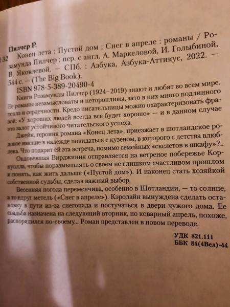 ОписаниеКниги Розамунды Пилчер (1924-2019) знают и любят во всем мире. Ее романы незамысловаты и неторопливы, зато в них много подлинного тепла и сердечности. Кредо писательницы можно охарактеризовать фразой: "У хороших людей всегда все будет хорошо", - и в данном случае это залог устойчивого читательского успеха. Джейн, героиня романа "Конец лета", приезжает в шотландское родовое имение в надежде повидаться с кузеном, в которого с детства влюблена. Что подарит ей эта встреча, помимо семейных "скелетов в шкафу"?.. Овдовевшая Вирджиния отправляется на ветреное побережье Корнуолла, чтобы поразмышлять о своем не слишком счастливом прошлом и понять, как жить дальше ("Пустой дом"). И наконец стать хозяйкой собственной судьбы, сделав важный выбор. Весенняя погода переменчива, особенно в Шотландии, - то солнце, а то вдруг метель ("Снег в апреле"). Кэролайн вынуждена сделать остановку в пути из-за снегопада и постучаться в двери чужого дома. День ее свадьбы назначен на следующий вторник, но коварный апрель, похоже, распорядился по-своему... Роман представлен в новом переводе.СвернутьКниги Розамунды Пилчер (1924-2019) знают и любят во всем мире. Ее романы незамысловаты и неторопливы, зато в них много подлинного тепла и сердечности. Кредо писательницы можно охарактеризовать фразой: "У хороших людей всегда все будет хорошо", - и в данном случае это залог устойчивого читательского успеха. Джейн, героиня романа "Конец лета", приезжает в шотландское родовое имение в надежде повидаться с кузеном, в которого с детства влюблена. Что подарит ей эта встреча, помимо семейных "скелетов в шкафу"?.. Овдовевшая Вирджиния отправляется на ветреное побережье Корнуолла, чтобы поразмышлять о своем не слишком счастливом прошлом и понять, как жить дальше ("Пустой дом"). И наконец стать хозяйкой собственной судьбы, сделав важный выбор. Весенняя погода переменчива, особенно в Шотландии, - то солнце, а то вдруг метель ("Снег в апреле"). Кэролайн вынуждена сделать остановку в пути из-за снегопада и постучаться в двери чужого дома. День ее свадьбы назначен на следующий вторник, но коварный апрель, похоже, распорядился по-своему... Роман представлен в новом переводе.СвернутьСвернуть