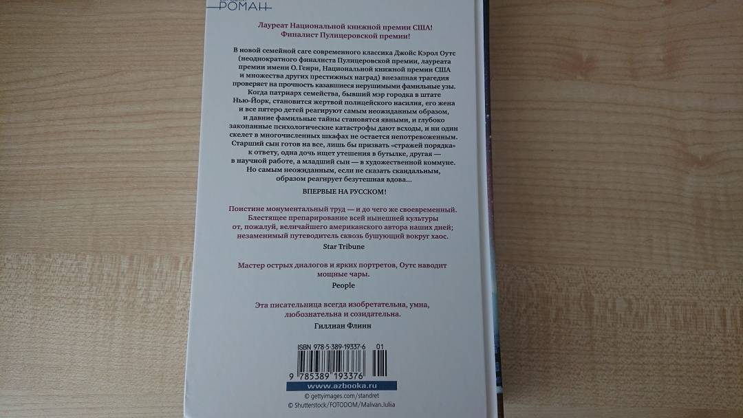 ОписаниеВ новой семейной саге современного классика Джойс Кэрол Оутс (неоднократного финалиста Пулицеровской премии, лауреата премии имени О. Генри, Национальной книжной премии США и множества других престижных наград) внезапная трагедия проверяет на прочность казавшиеся нерушимыми фамильные узы. Когда патриарх семейства, бывший мэр городка в штате Нью-Йорк, становится жертвой полицейского насилия, его жена и все пятеро детей реагируют самым неожиданным образом, и давние фамильные тайны становятся явными, и глубоко закопанные психологические катастрофы дают всходы, и ни один скелет в многочисленных шкафах не остается непотревоженным. Старший сын готов на все, лишь бы призвать "стражей порядка" к ответу, одна дочь ищет утешения в бутылке, другая - в научной работе, а младший сын - в художественной коммуне. Но самым неожиданным, если не сказать скандальным, образом реагирует безутешная вдова..."Поистине монументальный труд - и до чего же своевременный" (Star Tribune). Впервые на русском!СвернутьВ новой семейной саге современного классика Джойс Кэрол Оутс (неоднократного финалиста Пулицеровской премии, лауреата премии имени О. Генри, Национальной книжной премии США и множества других престижных наград) внезапная трагедия проверяет на прочность казавшиеся нерушимыми фамильные узы. Когда патриарх семейства, бывший мэр городка в штате Нью-Йорк, становится жертвой полицейского насилия, его жена и все пятеро детей реагируют самым неожиданным образом, и давние фамильные тайны становятся явными, и глубоко закопанные психологические катастрофы дают всходы, и ни один скелет в многочисленных шкафах не остается непотревоженным. Старший сын готов на все, лишь бы призвать "стражей порядка" к ответу, одна дочь ищет утешения в бутылке, другая - в научной работе, а младший сын - в художественной коммуне. Но самым неожиданным, если не сказать скандальным, образом реагирует безутешная вдова..."Поистине монументальный труд - и до чего же своевременный" (Star Tribune). Впервые на русском!СвернутьСвернуть