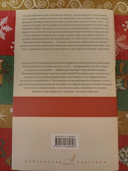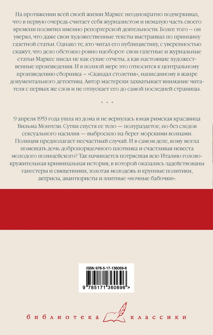 ОписаниеГабриэль Гарсиа Маркес - величайший писатель ХХ века, лауреат Нобелевской премии, автор всемирно известных романов "Сто лет одиночества", "Любовь во время чумы" и "Осень патриарха". На протяжении всей своей жизни Маркес неоднократно подчеркивал, что в первую очередь считает себя журналистом и немалую часть своего времени посвятил именно репортерской деятельности. Более того - он уверял, что даже свои художественные тексты выстраивал по принципу газетной статьи. Однако те, кто читал его публицистику, с уверенностью скажут, что дело обстояло ровно наоборот: свои газетные и журнальные статьи Маркес писал не как сухие отчеты, а как настоящие художественные произведения. И в полной мере это относится к центральному произведению сборника - "Скандал столетия", написанному в жанре документального детектива. Автор мастерски захватывает внимание читателя с первых же слов и не отпускает его до самой последней страницы.* * * 9 апреля 1953-го года ушла из дома и не вернулась юная римская красавица Вильма Монтези. Сутки спустя ее тело - полураздетое, но без следов сексуального насилия - выбросило на берег морскими волнами. Полиция предполагает несчастный случай. И в самом деле, кому могла помешать дочь добропорядочного плотника и счастливая невеста молодого полицейского? Так начинается потрясшая всю Италию головокружительная криминальная история, в которой оказались задействованы гангстеры и звезды эстрады, "золотая молодежь" и крупные политики, актрисы, авантюристы и элитные "ночные бабочки".СвернутьГабриэль Гарсиа Маркес - величайший писатель ХХ века, лауреат Нобелевской премии, автор всемирно известных романов "Сто лет одиночества", "Любовь во время чумы" и "Осень патриарха". На протяжении всей своей жизни Маркес неоднократно подчеркивал, что в первую очередь считает себя журналистом и немалую часть своего времени посвятил именно репортерской деятельности. Более того - он уверял, что даже свои художественные тексты выстраивал по принципу газетной статьи. Однако те, кто читал его публицистику, с уверенностью скажут, что дело обстояло ровно наоборот: свои газетные и журнальные статьи Маркес писал не как сухие отчеты, а как настоящие художественные произведения. И в полной мере это относится к центральному произведению сборника - "Скандал столетия", написанному в жанре документального детектива. Автор мастерски захватывает внимание читателя с первых же слов и не отпускает его до самой последней страницы.* * * 9 апреля 1953-го года ушла из дома и не вернулась юная римская красавица Вильма Монтези. Сутки спустя ее тело - полураздетое, но без следов сексуального насилия - выбросило на берег морскими волнами. Полиция предполагает несчастный случай. И в самом деле, кому могла помешать дочь добропорядочного плотника и счастливая невеста молодого полицейского? Так начинается потрясшая всю Италию головокружительная криминальная история, в которой оказались задействованы гангстеры и звезды эстрады, "золотая молодежь" и крупные политики, актрисы, авантюристы и элитные "ночные бабочки".СвернутьСвернуть