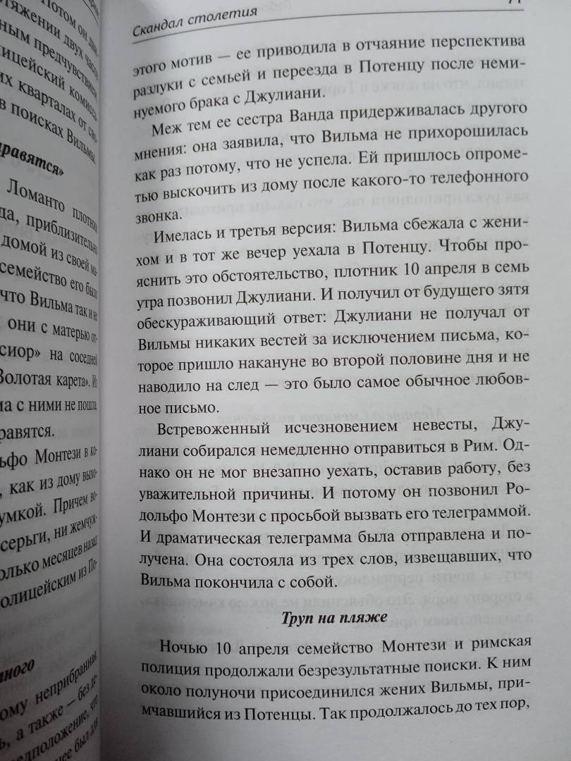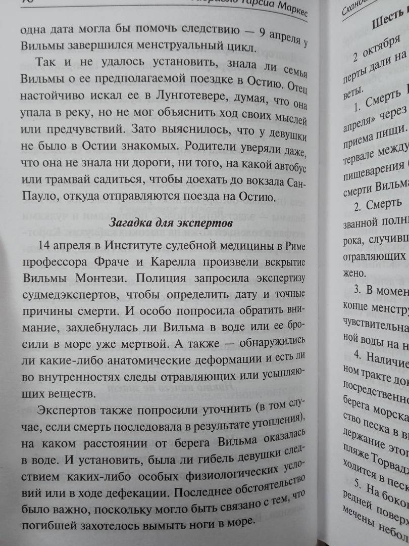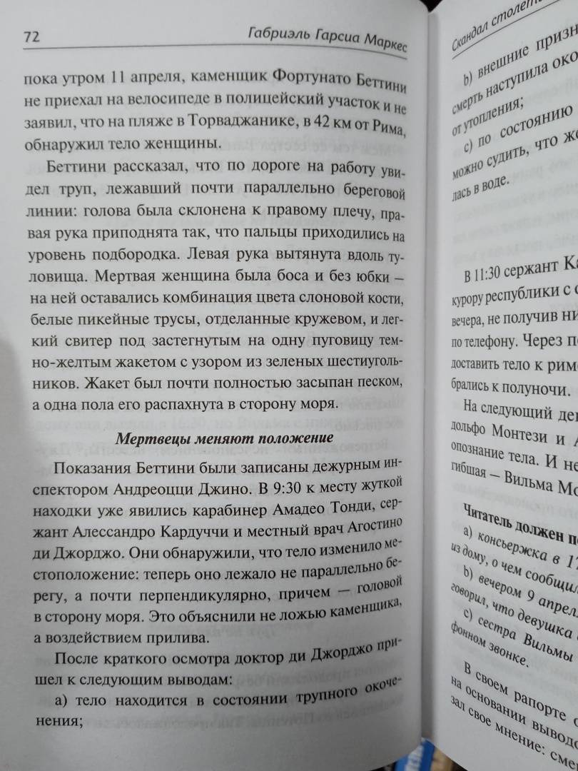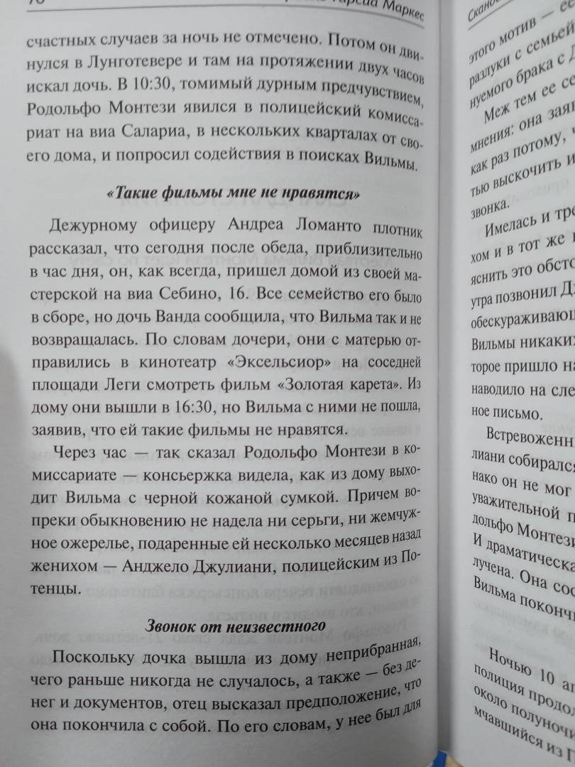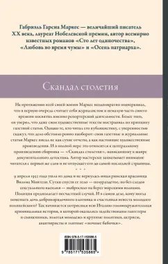 ОписаниеГабриэль Гарсиа Маркес - величайший писатель ХХ века, лауреат Нобелевской премии, автор всемирно известных романов "Сто лет одиночества", "Любовь во время чумы" и "Осень патриарха".На протяжении всей своей жизни Маркес неоднократно подчеркивал, что в первую очередь считает себя журналистом и немалую часть своего времени посвятил именно репортерской деятельности. Более того - он уверял, что даже свои художественные тексты выстраивал по принципу газетной статьи. Однако те, кто читал его публицистику, с уверенностью скажут, что дело обстояло ровно наоборот: свои газетные и журнальные статьи Маркес писал не как сухие отчеты, а как настоящие художественные произведения. И в полной мере это относится к центральному произведению сборника - "Скандал столетия", написанному в жанре документального детектива. Автор мастерски захватывает внимание читателя с первых же слов и не отпускает его до самой последней страницы.9 апреля 1953-го года ушла из дома и не вернулась юная римская красавица Вильма Монтези. Сутки спустя ее тело - полураздетое, но без следов сексуального насилия - выбросило на берег морскими волнами. Полиция предполагает несчастный случай. И в самом деле, кому могла помешать дочь добропорядочного плотника и счастливая невеста молодого полицейского? Так начинается потрясшая всю Италию головокружительная криминальная история, в которой оказались задействованы гангстеры и звезды эстрады, "золотая молодежь" и крупные политики, актрисы, авантюристы и элитные "ночные бабочки".СвернутьГабриэль Гарсиа Маркес - величайший писатель ХХ века, лауреат Нобелевской премии, автор всемирно известных романов "Сто лет одиночества", "Любовь во время чумы" и "Осень патриарха".На протяжении всей своей жизни Маркес неоднократно подчеркивал, что в первую очередь считает себя журналистом и немалую часть своего времени посвятил именно репортерской деятельности. Более того - он уверял, что даже свои художественные тексты выстраивал по принципу газетной статьи. Однако те, кто читал его публицистику, с уверенностью скажут, что дело обстояло ровно наоборот: свои газетные и журнальные статьи Маркес писал не как сухие отчеты, а как настоящие художественные произведения. И в полной мере это относится к центральному произведению сборника - "Скандал столетия", написанному в жанре документального детектива. Автор мастерски захватывает внимание читателя с первых же слов и не отпускает его до самой последней страницы.9 апреля 1953-го года ушла из дома и не вернулась юная римская красавица Вильма Монтези. Сутки спустя ее тело - полураздетое, но без следов сексуального насилия - выбросило на берег морскими волнами. Полиция предполагает несчастный случай. И в самом деле, кому могла помешать дочь добропорядочного плотника и счастливая невеста молодого полицейского? Так начинается потрясшая всю Италию головокружительная криминальная история, в которой оказались задействованы гангстеры и звезды эстрады, "золотая молодежь" и крупные политики, актрисы, авантюристы и элитные "ночные бабочки".СвернутьСвернуть