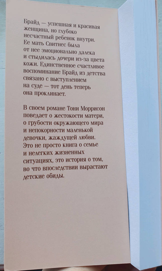 ОписаниеБрайд успешная и красивая женщина, но глубоко несчастный ребенок внутри. Ее мать, Свитнес, была от нее эмоционально далека и стыдилась дочери из-за цвета кожи. Единственное счастливое воспоминание Брайд из детства связано с выступлением на суде — тот день теперь она проклинает. В своем романе Тони Моррисон поведает о жестокости матери, о грубости окружающего мира и непокорности маленькой девочки, жаждущей любви. Это не просто книга о семье и нелегких жизненных ситуациях, это история о том, во что впоследствии вырастают детские обиды. Брайд успешная и красивая женщина, но глубоко несчастный ребенок внутри. Ее мать, Свитнес, была от нее эмоционально далека и стыдилась дочери из-за цвета кожи. Единственное счастливое воспоминание Брайд из детства связано с выступлением на суде — тот день теперь она проклинает. В своем романе Тони Моррисон поведает о жестокости матери, о грубости окружающего мира и непокорности маленькой девочки, жаждущей любви. Это не просто книга о семье и нелегких жизненных ситуациях, это история о том, во что впоследствии вырастают детские обиды.