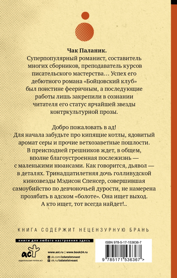 ОписаниеЧак Паланик. "Сумасшедший гений" не "поколения Икс", но - поколения следующего. Автор, чьи романы "Удушье", "Колыбельная", "Уцелевший" и "Невидимки" снискали славу культовой классики современной альтернативной прозы. Автор, который действительно "взорвал мир" своим легендарным "Бойцовским клубом".Чак Паланик. Писатель, которого уже называют Уильямом Берроузом нашего времени.Добро пожаловать в ад!Для начала, забудьте про кипящие котлы, ядовитый аромат серы и прочие ветхозаветные пошлости. В преисподней грешников ждет, в общем, вполне благоустроенная послежизнь, - с маленькими нюансами. Как говорится, "дьявол - в деталях".Тринадцатилетняя дочь голливудской кинозвезды Мэдисон Спенсер, совершившая самоубийство по девчоночьей дурости, не намерена прозябать в адском "болоте". Она ищет выход. А кто ищет, тот всегда найдет!..Чак Паланик. "Сумасшедший гений" не "поколения Икс", но - поколения следующего. Автор, чьи романы "Удушье", "Колыбельная", "Уцелевший" и "Невидимки" снискали славу культовой классики современной альтернативной прозы. Автор, который действительно "взорвал мир" своим легендарным "Бойцовским клубом".Чак Паланик. Писатель, которого уже называют Уильямом Берроузом нашего времени.Добро пожаловать в ад!Для начала, забудьте про кипящие котлы, ядовитый аромат серы и прочие ветхозаветные пошлости. В преисподней грешников ждет, в общем, вполне благоустроенная послежизнь, - с маленькими нюансами. Как говорится, "дьявол - в деталях".Тринадцатилетняя дочь голливудской кинозвезды Мэдисон Спенсер, совершившая самоубийство по девчоночьей дурости, не намерена прозябать в адском "болоте". Она ищет выход. А кто ищет, тот всегда найдет!..