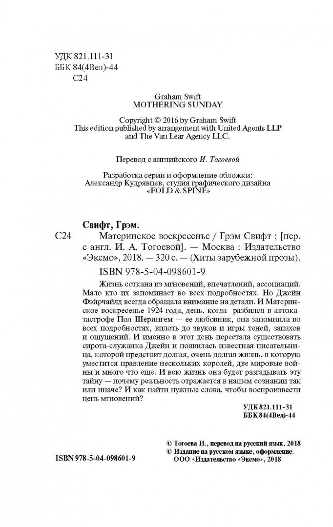 ОписаниеЖизнь соткана из мгновений, впечатлений, ассоциаций. Мало кто их запоминает во всех подробностях. Но Джейн Фэйрчайлд всегда обращала внимание на детали. И Материнское воскресенье 1924 года, день, когда разбился в автокатастрофе Пол Шерингем - ее любовник, она запомнила во всех подробностях - вплоть до звуков и игры теней, запахов и ощущений. И именно в этот день перестала существовать сирота-служанка Джейн и появилась известная писательница, которой предстоит долгая, очень долгая жизнь, в которую уместится правление нескольких королей, две мировые войны и много что еще. И всю жизнь она будет разгадывать эту тайну - почему реальность отражается в нашем сознании так или иначе? И как найти нужные слова, чтобы воспроизвести цепь мгновений?Жизнь соткана из мгновений, впечатлений, ассоциаций. Мало кто их запоминает во всех подробностях. Но Джейн Фэйрчайлд всегда обращала внимание на детали. И Материнское воскресенье 1924 года, день, когда разбился в автокатастрофе Пол Шерингем - ее любовник, она запомнила во всех подробностях - вплоть до звуков и игры теней, запахов и ощущений. И именно в этот день перестала существовать сирота-служанка Джейн и появилась известная писательница, которой предстоит долгая, очень долгая жизнь, в которую уместится правление нескольких королей, две мировые войны и много что еще. И всю жизнь она будет разгадывать эту тайну - почему реальность отражается в нашем сознании так или иначе? И как найти нужные слова, чтобы воспроизвести цепь мгновений?