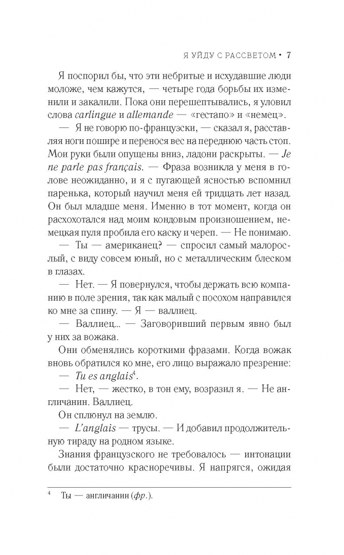 ОписаниеАвгуст 1944 года. Валлиец Риз Гравенор меряет шагами улицы только что освобожденного от фашистских оккупантов Парижа, но на сердце у бывшего солдата, ветерана Первой мировой, тяжело… В начале войны он обвинил единственного сына Оуэна в трусости и нежелании воевать.И тот ушел - туда, где гибли люди. Оуэн не хотел убивать, наоборот, мечтал спасать обреченных на смерть. А затем связь с ним оборвалась... Пытаясь выйти на след пропавшего сына, Риз знакомится с молодой француженкой по имени Шарлотта - девушка лихо управляет санитарным грузовичком, метко стреляет, а еще явно что-то скрывает. Отныне они вместе, и их путь лежит через Францию в заснеженные Альпы. Туда, где темные ночи сменяются великолепными рассветами, но еще звучат выстрелы, и каждый новый день может стать последним.Август 1944 года. Валлиец Риз Гравенор меряет шагами улицы только что освобожденного от фашистских оккупантов Парижа, но на сердце у бывшего солдата, ветерана Первой мировой, тяжело… В начале войны он обвинил единственного сына Оуэна в трусости и нежелании воевать.И тот ушел - туда, где гибли люди. Оуэн не хотел убивать, наоборот, мечтал спасать обреченных на смерть. А затем связь с ним оборвалась... Пытаясь выйти на след пропавшего сына, Риз знакомится с молодой француженкой по имени Шарлотта - девушка лихо управляет санитарным грузовичком, метко стреляет, а еще явно что-то скрывает. Отныне они вместе, и их путь лежит через Францию в заснеженные Альпы. Туда, где темные ночи сменяются великолепными рассветами, но еще звучат выстрелы, и каждый новый день может стать последним.