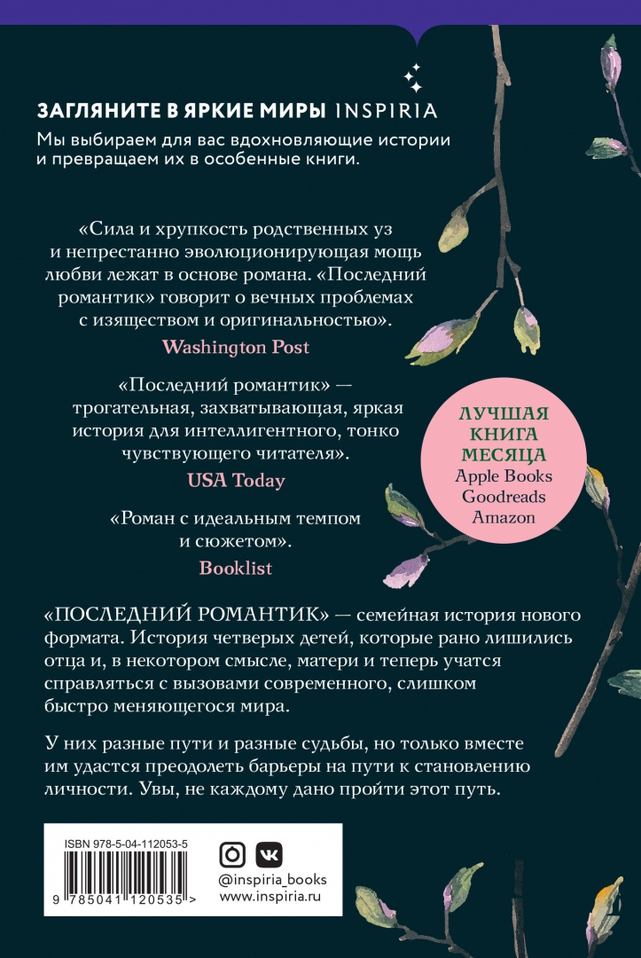 Описание"Последний романтик" - семейная сага нового формата. История четверых детей, которые рано лишились отца и, в некоторым смысле, матери и теперь учатся справляться с вызовами современного, слишком быстро меняющегося мира. У них разные пути и разные судьбы, но только вместе им удастся преодолеть все преграды на пути к становлению личности. Вот только не каждому дано пройти этот сложный путь.*В книгах Inspiria, выпущенных в 2020 году, доступен к прослушиванию только пробный фрагмент аудио. В книгах, выпущенных позже 2020 года, мы предоставляем доступ к полной аудиоверсии."Последний романтик" - семейная сага нового формата. История четверых детей, которые рано лишились отца и, в некоторым смысле, матери и теперь учатся справляться с вызовами современного, слишком быстро меняющегося мира. У них разные пути и разные судьбы, но только вместе им удастся преодолеть все преграды на пути к становлению личности. Вот только не каждому дано пройти этот сложный путь.*В книгах Inspiria, выпущенных в 2020 году, доступен к прослушиванию только пробный фрагмент аудио. В книгах, выпущенных позже 2020 года, мы предоставляем доступ к полной аудиоверсии.